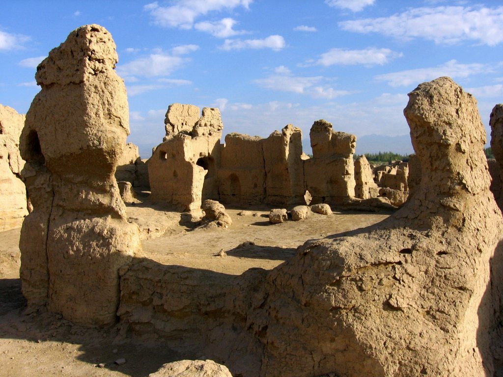 자오허 고성은 중국 신장 위구르 자치구 투르판 분지에 위치한 고대 도시 유적이다. 기원전 2세기 이전에 차사인이 거주하기 시작하여 차사전국의 수도였으며, 한나라, 당나라, 위구르 제국 시대를 거쳐 14세기 몽골의 침략으로 파괴될 때까지 실크로드의 중요한 거점 역할을 했다. 자연적으로 형성된 강으로 둘러싸인 섬 위에 건설되어 독특한 구조를 가지며, 1961년부터 중화인민공화국 정부에 의해 보존되어 2014년 유네스코 세계 유산으로 등재되었다. 고성 중앙에는 대로가 관통하며, 동서 구역으로 나뉘어 관부, 사찰 구역으로 구성되어 있다.