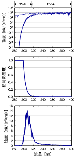 자외선은 파장에 따라 A영역(UV-A; 파장 315~400nm), B영역(UV-B; 파장 280~315nm), C영역(UV-C; 파장 100~280nm)으로 나뉜다. 태양에서 지구에 도달한 자외선은 대기권에 들어오기 전에는 강도를 가지고 있지만, 대기를 진행하는 동안 성층권 오존에 의한 흡수와 공기 분자, 에어로졸에 의한 산란 등을 받아 서서히 감쇠한다. UV-B가 짧은 파장일수록 크게 감쇠하는 것은 오존에 의한 흡수 때문이며, 더 짧은 파장의 UV-C는 산소와 오존에 완전히 흡수되어 지상에서는 전혀 관측되지 않는다. 이처럼 자외선은 파장에 따라 강도가 크게 다르기 때문에 자외선의 강도를 알기 쉽게 표현하기 위해서는 고안이 필요하다.[33]