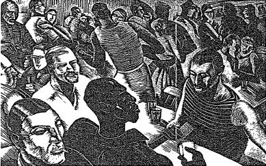 사르트르의 파리, 전쟁 전야 – "쾌활함...카페". 이안 맥냅의 판화. (1947년 7월 13일, 《뉴욕 타임스》의 《이성의 시대》 서평에 게재)