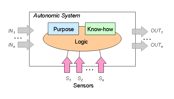 자율 시스템은 외부 운영 환경을 관찰하는 센서(Si)를 가지고 있다. 또한 자체적으로 작동하기 위한 목적(의도)과 노하우(부트스트래핑, 구성 지식 등)를 포함하고 있다.[2] 자율 시스템의 실제 작동은 논리에 의해 결정되는데, 이 논리는 목적을 달성하기 위한 올바른 결정을 내리고 운영 환경의 관찰 결과(센서 입력)에 영향을 받는다.[2]