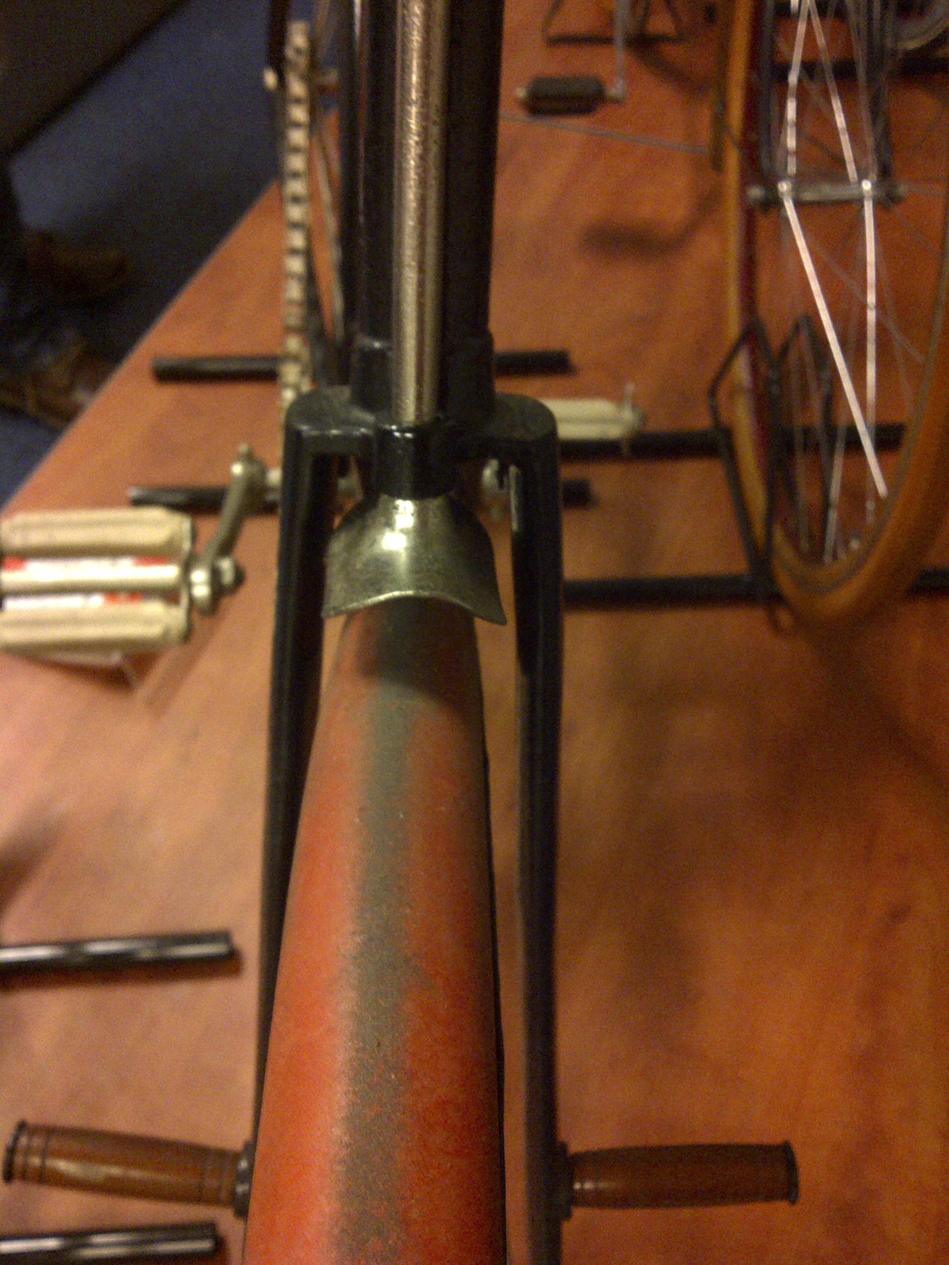 자전거의 다음 발전 단계인 페니 파딩 역시 유사한 스푼 브레이크를 사용하거나 페달을 뒤로 밟아 제동했다. 1870년부터 1878년까지 개발 기간 동안 다양한 브레이크 설계가 시도되었으며, 대부분 뒷바퀴에 작동하는 방식이었다. 그러나 뒷바퀴가 점점 작아지고 라이더의 무게 중심이 앞바퀴로 이동하면서 뒷바퀴 제동의 효과는 감소했다. 이에 1873년 존 킨이 앞바퀴 브레이크를 도입했고, 더 강력한 제동력 덕분에 1880년경에는 이 방식이 일반적으로 채택되었다.[3]