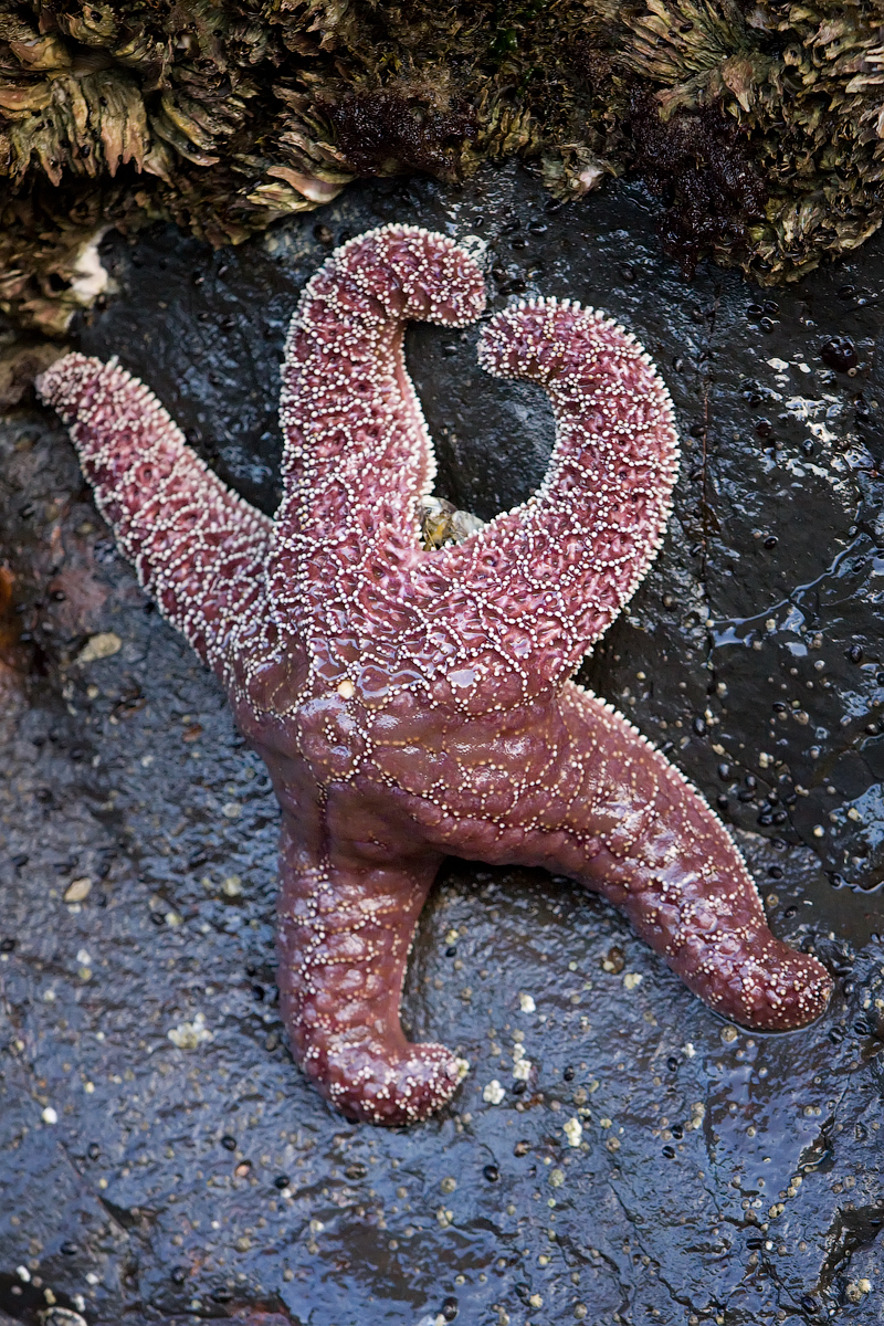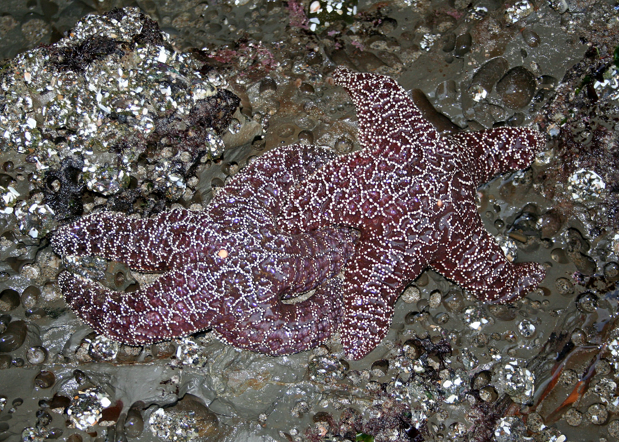 자주불가사리(''Pisaster ochraceus'')는 유생 단계에서는 플랑크톤을 먹는 여과 섭식자이지만, 성체가 되면 홍합의 일종인 ''Mytilus californianus''와 ''Mytilus trossulus''를 먹는다. 또한 키톤, 삿갓조개, 달팽이, 따개비, 성게류, 심지어 십각류 갑각류도 먹는다.[4][9][10]
