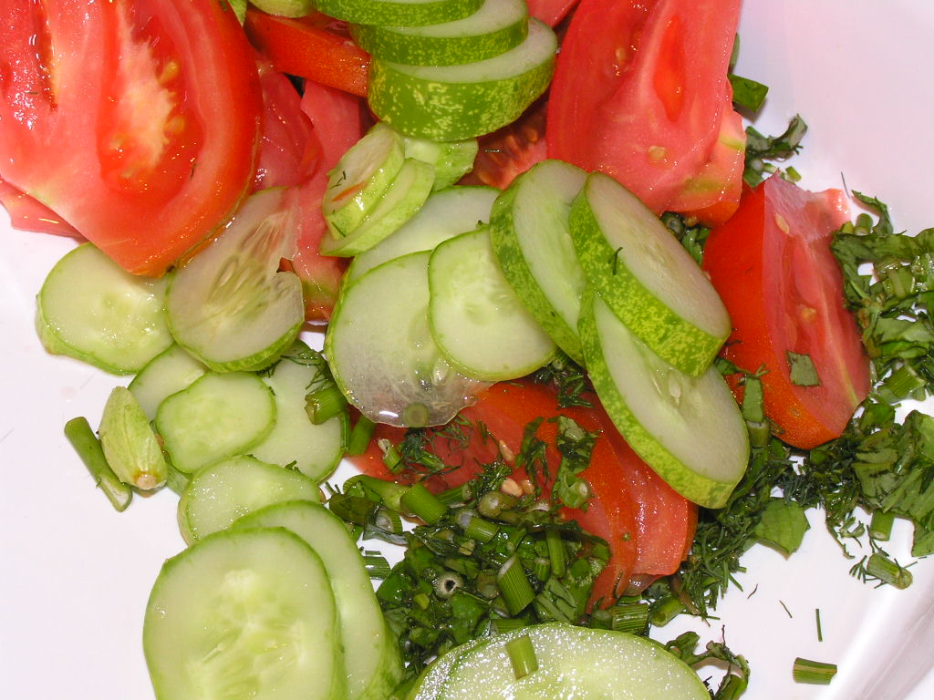--러시아 이외의 국가에서 "러시아 샐러드"라는 이름으로 불리는 경우가 많은 요리는 감자 샐러드 (올리비에 샐러드)와 비네그레 샐러드 두 가지이다.[26] 러시아 요리에서는 감자 샐러드는 메인 요리의 곁들임이 아닌 독립적인 자쿠스카(요리)로 취급된다.[11]기타흰 빵과 검은 빵, 버터, 치즈, 피로시키, 블리니, 피로크, 파시테트, 포르쉬마크, 줄리엔, 부테르브로디--