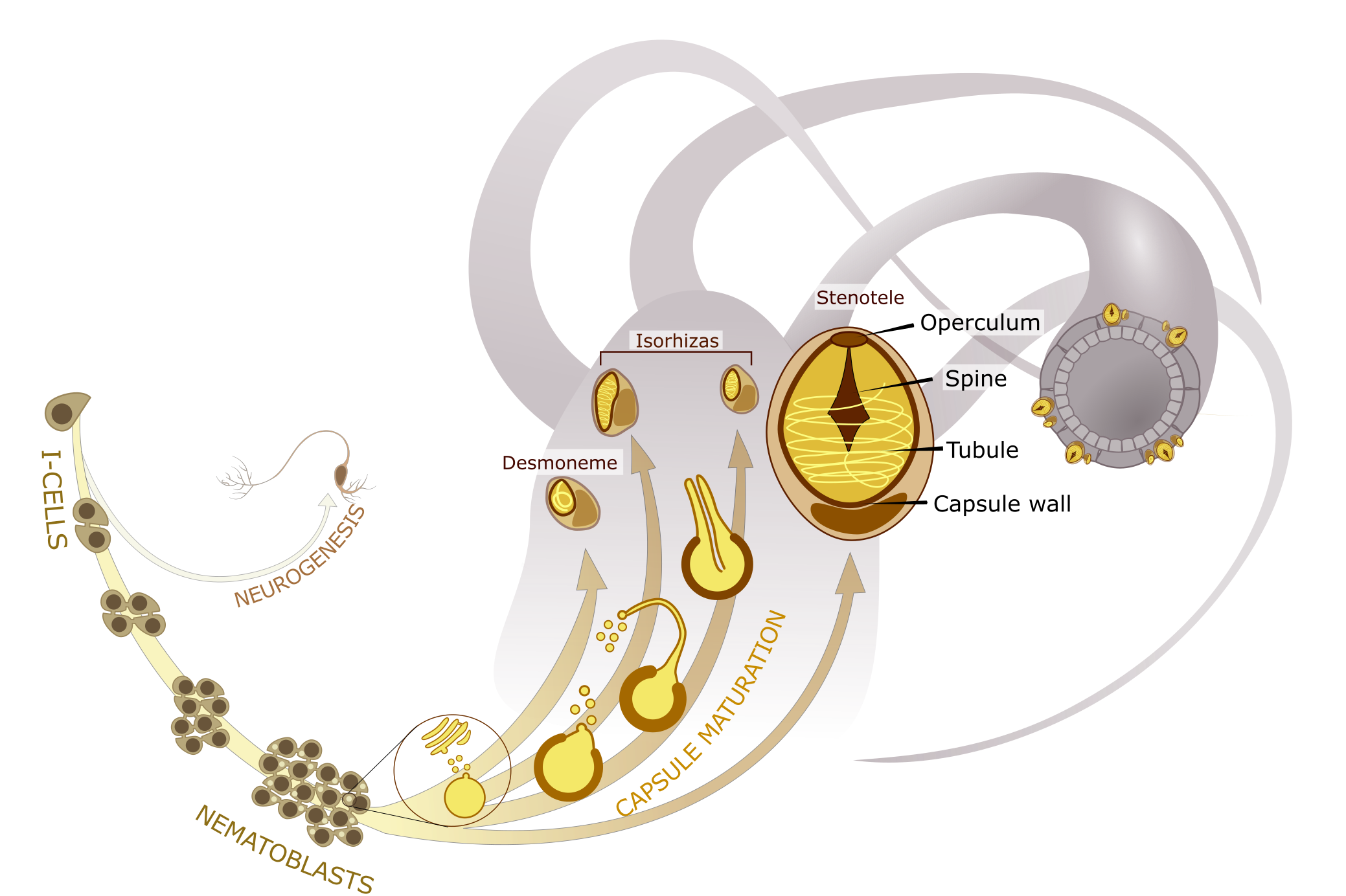 자포는 거대한 골지체 이후 소포로부터 여러 단계의 조립 과정을 거쳐 형성된다. 골지체에서 나온 소포는 먼저 1차 소포인 캡슐 원기(capsule primordium)에 융합된다.[8] 그 후, 소포 융합을 통해 캡슐 외부에 세관이 형성되고, 이 세관이 캡슐 내부로 함입된다.[8] 그런 다음, 초기 성숙 단계를 통해 spinalin 단백질의 응축을 통해 함입된 세관에 가시 돌기가 길게 배열된다.[8] 마지막으로, 후기 성숙 단계에서 폴리-γ-글루탐산이 캡슐 기질로 합성되어 높은 삼투압 하에서 방출되지 않은 캡슐이 생성된다.[8] 이렇게 갇힌 삼투압은 대규모 삼투압 쇼크를 통해 자극 시 빠른 실 배출을 가능하게 한다.[8]5. 자포의 독성