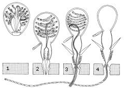 - 권착자포 (Spirocyst): 작고 둥근 모양으로, 끈끈한 실을 발사하여 먹이를 휘감는다.