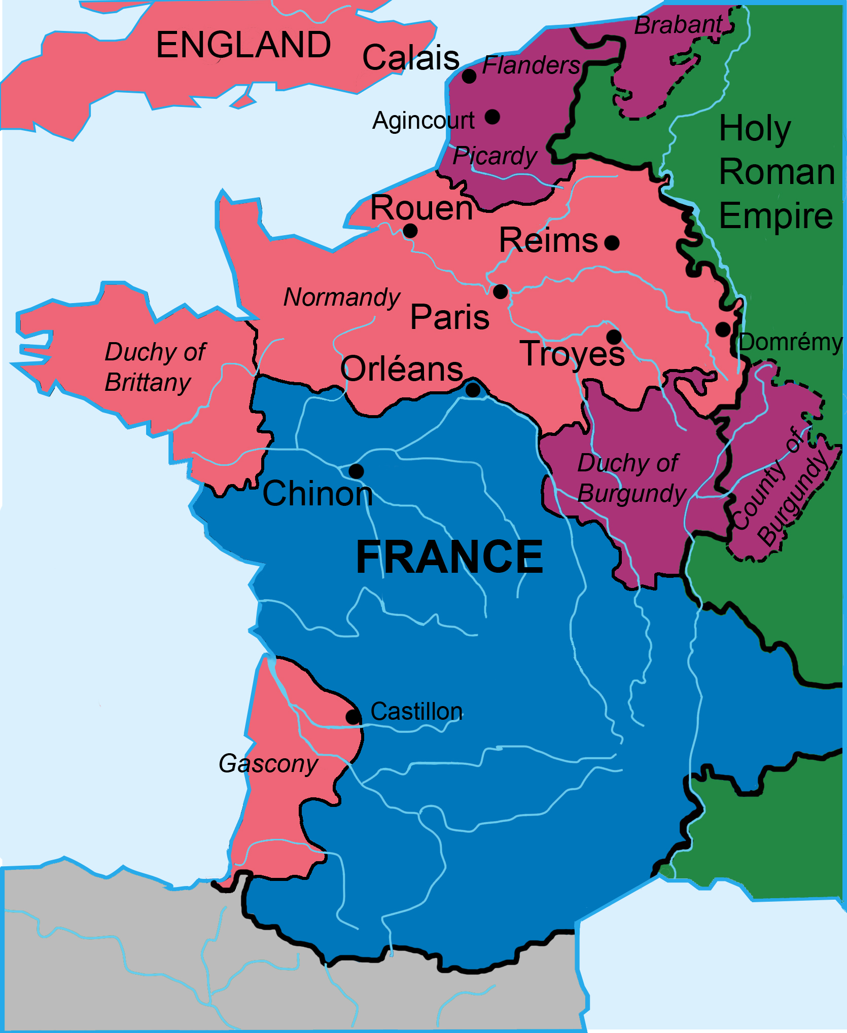 1435년 백년 전쟁 상황 지도. 붉은색이 잉글랜드 영역이고, 푸른색이 프랑스 영토이다.