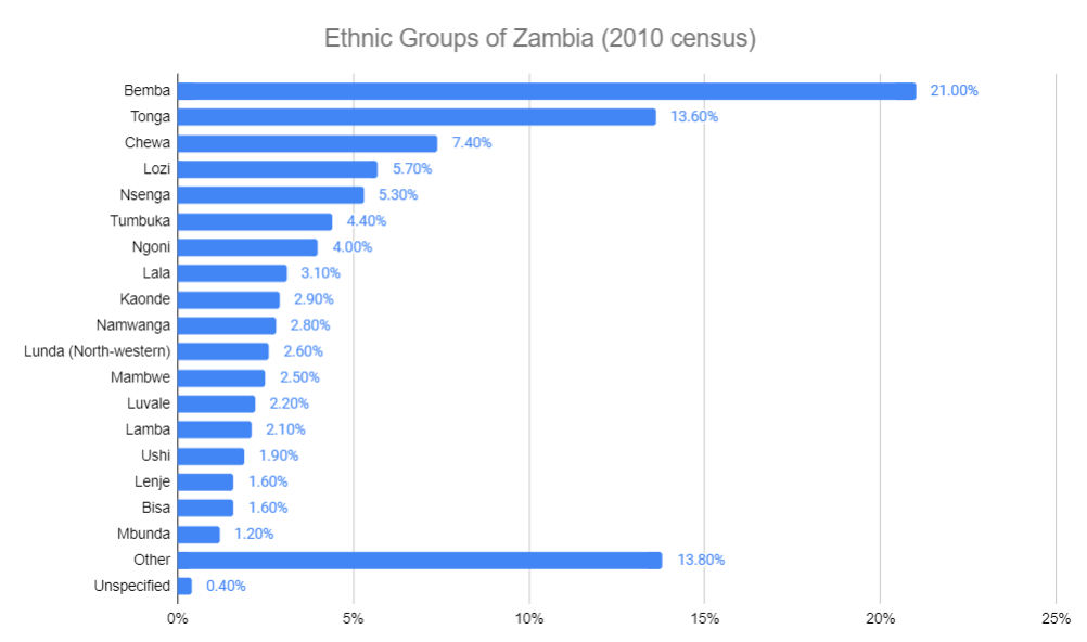 유엔(UN) 자료에 따르면, 잠비아의 총 인구는 1950년 2,340,000명에서 크게 증가하여 2010년에는 13,092,666명, 2022년에는 19,693,423명을 기록했다.[5] 2010년 기준 연령 구조를 보면, 15세 미만 인구가 46.4%, 15세에서 64세 사이 인구가 50.6%, 65세 이상 인구가 3.1%를 차지했다.[4][6]