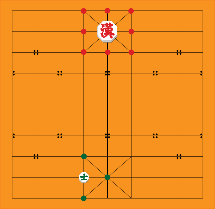 궁(장군) | 將/將 (북한), 漢/楚 (남한) | 각 1개 | 궁성 안에서 가로, 세로, 대각선으로 한 칸씩 이동 가능. 궁성을 벗어날 수 없다. |