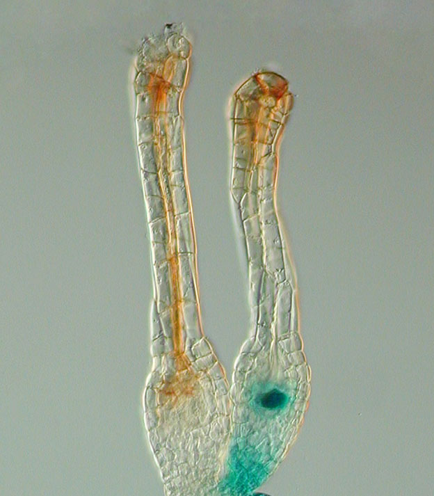 선태식물 및 기타 포자식물에서 정자는 물 막에서 헤엄쳐 장란기에 도달하는 반면, 구과식물과 피자식물에서는 꽃가루가 바람이나 동물을 통해 전달되고 정자는 꽃가루관을 통해 전달된다.이끼 ''Physcomitrella patens''에서 장란기는 내부에 위치하지 않고 잎이 있는 배우체의 상단에 위치한다(그림 참조). Polycomb 단백질 FIE는 GUS 리포터 시스템으로 염색한 후 파란색으로 나타나는 것처럼 수정되지 않은 난세포(오른쪽)에서 발현된다. 수정 직후, 어린 배아에서 FIE 유전자가 비활성화된다(파란색이 더 이상 보이지 않음, 왼쪽).[1][2]