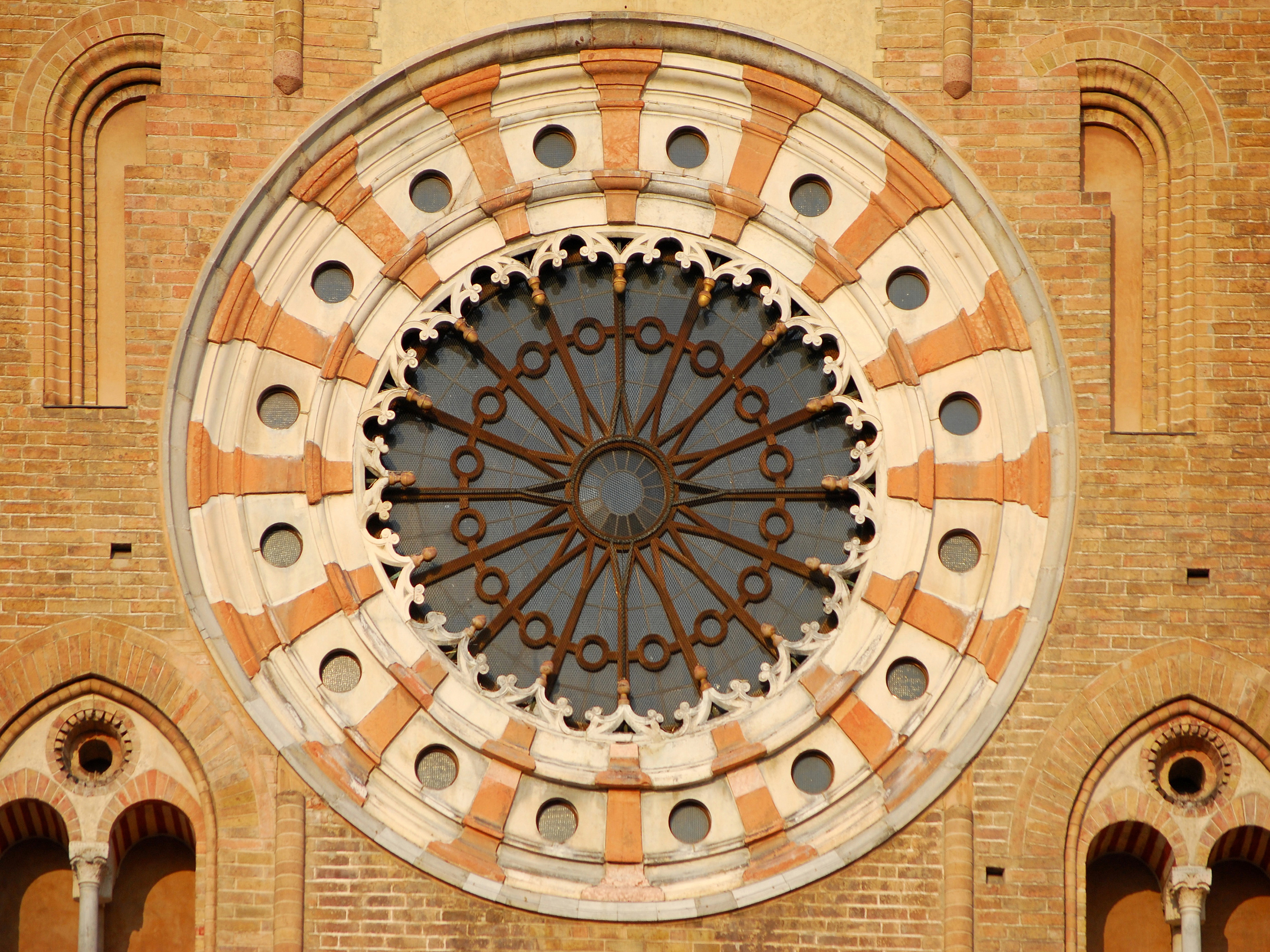 오큘리는 단순한 원형 창으로, 유약을 칠하거나 얇은 설화 석고로 채워져 있다. 후기 고딕 시대 이탈리아에서는 매우 큰 오큘리 창이 일반적이었는데, 트레이서리 무늬 창보다 선호되었으며, 두치오, 도나텔로, 우첼로, 기베르티를 포함한 중세 후기와 르네상스 초기의 가장 뛰어난 디자이너들이 디자인한 스테인드글라스의 정교한 그림으로 채워졌다.[31][32] 피렌체 대성당에서 오큘리 양식의 예를 볼 수 있다.3. 2. 둥근 창 (Wheel Window)