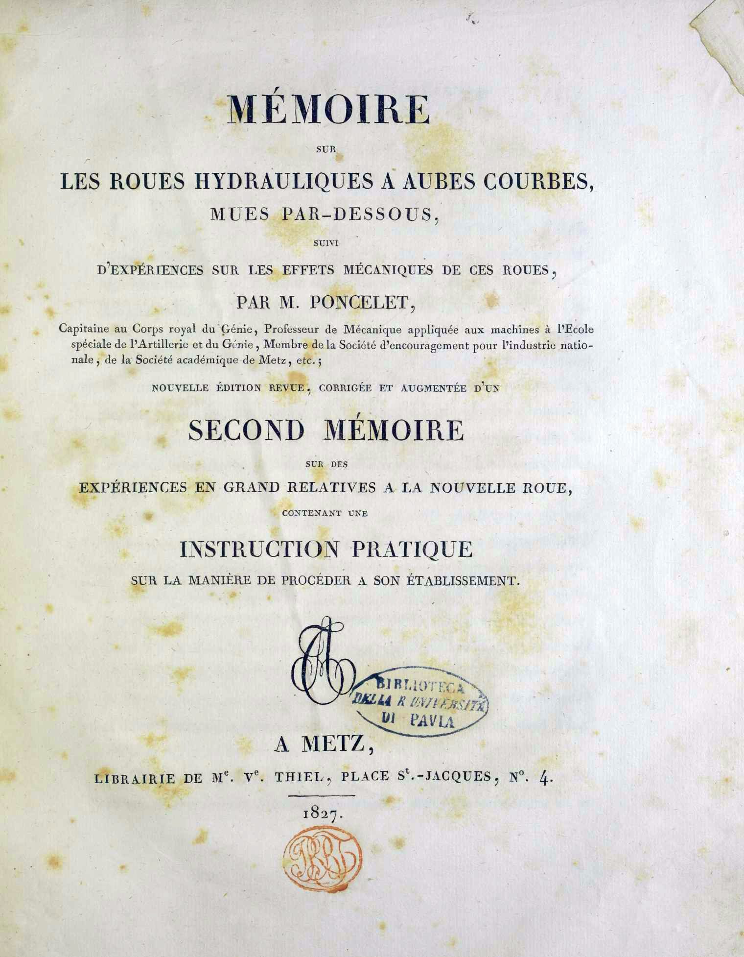 - (1827) 《밑에서 구동되는 곡선 날개를 가진 수차에 관한 논문》 (Mémoire sur les roues hydrauliques a aubes courbes, mues par-dessous|프랑스어)