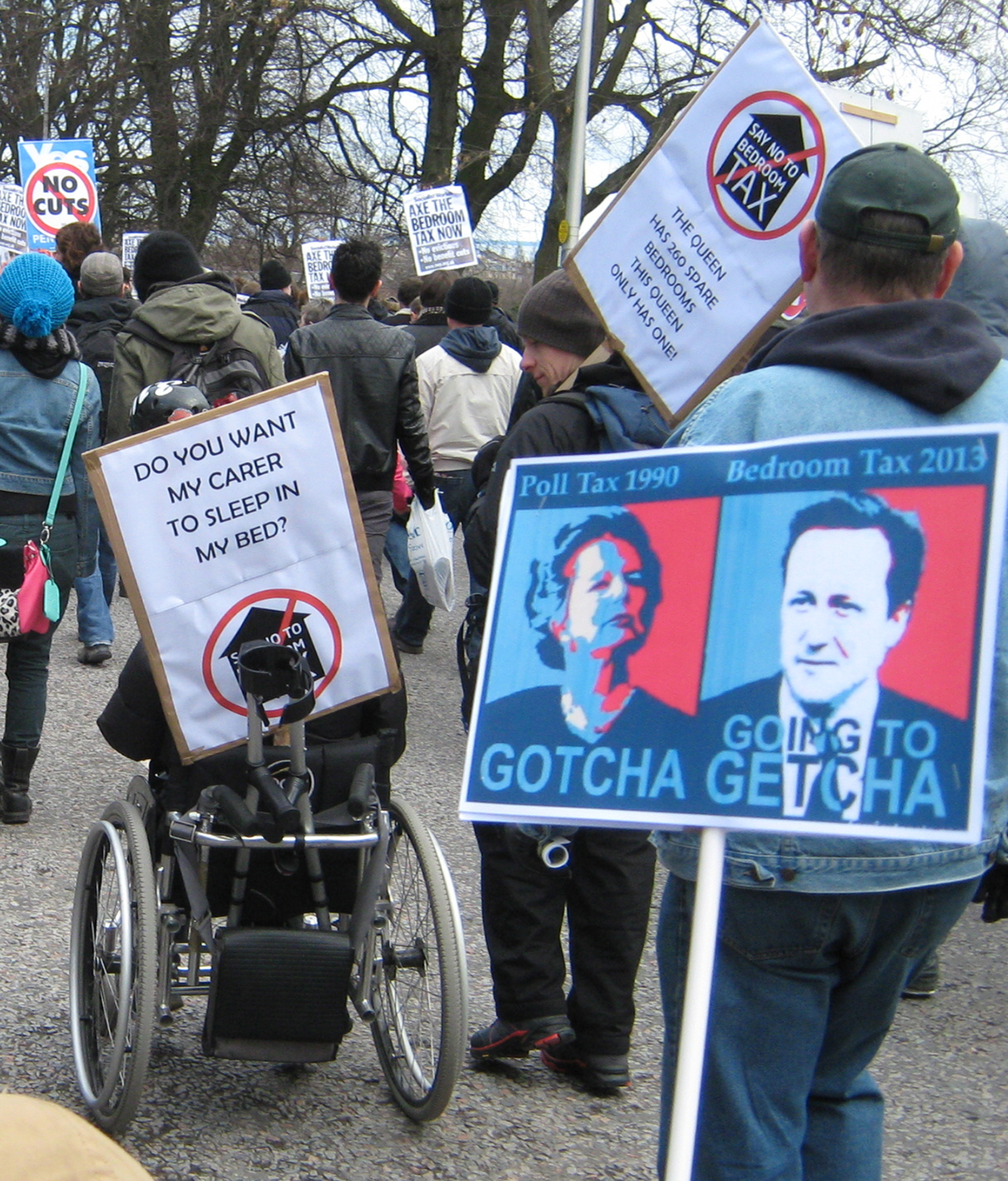 2012년 복지 개혁법에서 "침실세"(공식적으로는 과밀 거주 페널티)가 도입된 이후, 장애인 운동가들은 침실세 반대 시위의 발전에 중요한 역할을 해왔다.[35] 다양한 수혜 변경 사항들이 장애인들에게 불균형적으로 영향을 미치고 장애인들의 독립적인 삶의 권리를 침해할 것으로 추산된다.[36][37]