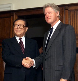 1997년 10월, 장쩌민은 미국을 방문하여 빌 클린턴 대통령과 양국 관계를 "전략적 건설적 파트너십"으로 규정하며 미중 협력의 틀을 마련했다.[170] 그러나 1999년 NATO의 유고슬라비아 공습과 중국 주재 미국 대사관 폭격 사건으로 미중 관계는 긴장되기도 했다.[171][172][173]
