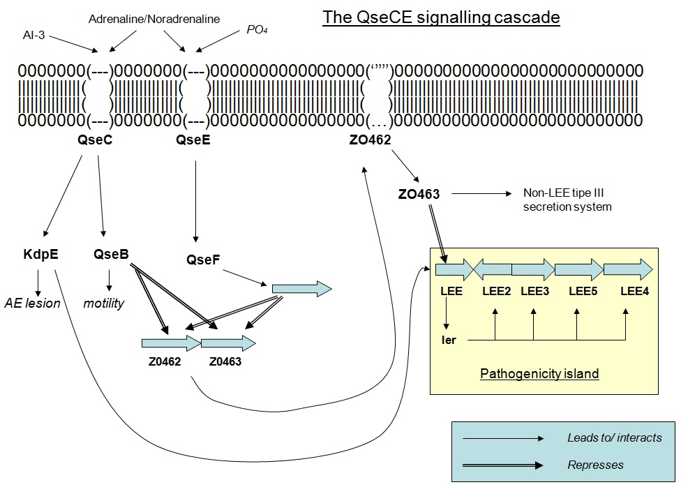 결과적으로 QseC는 QseB(편모를 활성화함), KpdE(LEE를 활성화함) 및 QseF를 인산화한다. QseE는 QseF를 인산화한다. QseBC와 QseEF는 FusK와 FusR의 발현을 억제한다. FusK와 FusR은 LEE 유전자의 전사를 억제하는 시스템의 두 가지 구성 요소이다. FusK는 퓨코스를 포함한 많은 당을 감지할 수 있는 센서 키나제이다. 퓨코스가 배지에 존재하면 FusK는 FusR을 인산화하여 LEE 발현을 억제한다.