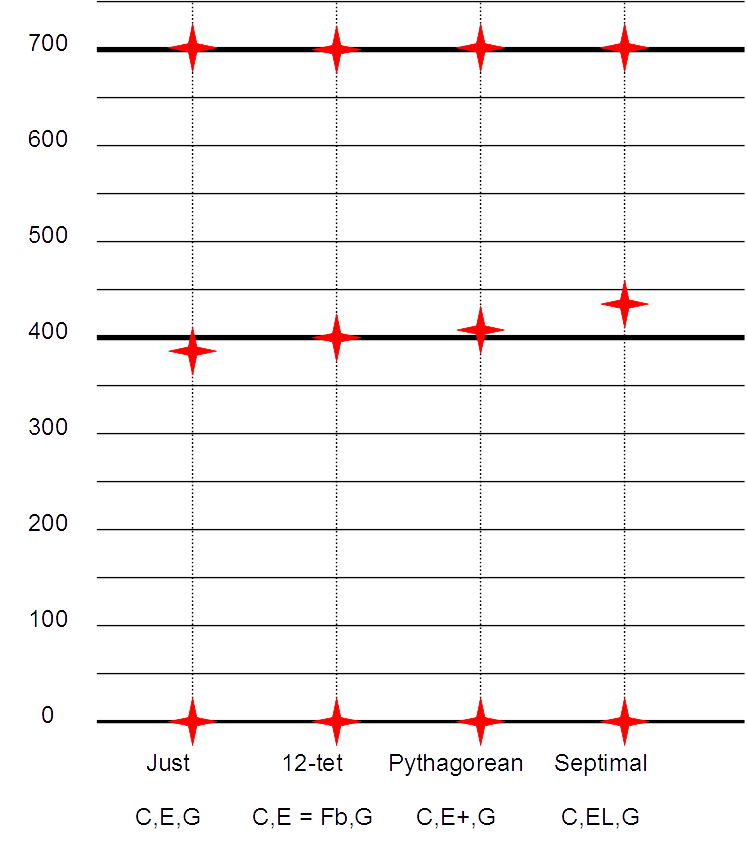 피타고라스 음률 | 1 : 81/64 : 3/2 | 1: 1.265625: 1.5 |