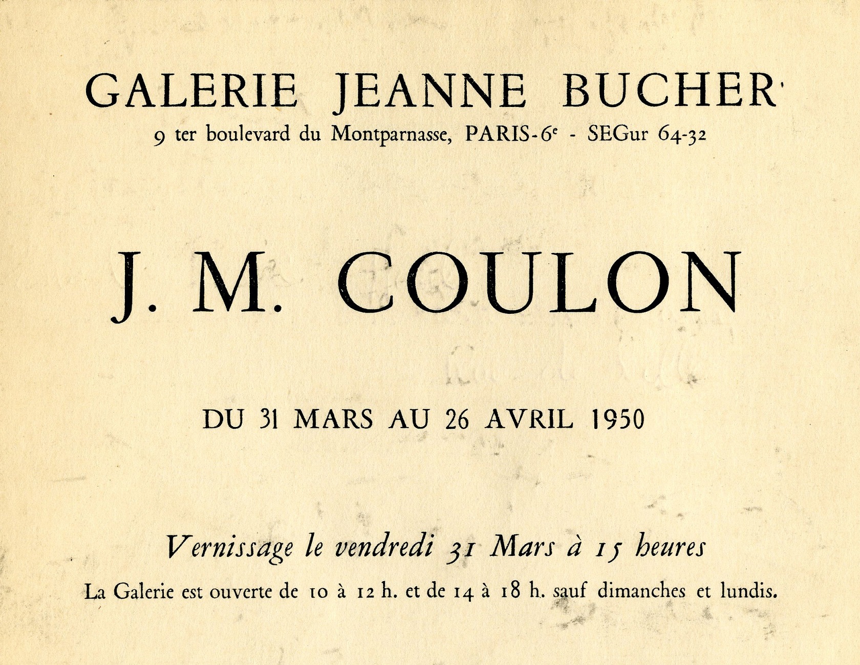 1945년, 장 미셸 쿨롱은 파리에서 회화 작업에 꾸준히 전념했다. 1949년에는 파리 음악학교에 유학 중인 미국인 바이올리니스트 캐롤라인 가라베디안을 만나 영어를 빠르게 익혔다. 같은 해, 잔 부셰 갤러리에서 열린 그룹전에 바실리 칸딘스키, 조르주 브라크, 파블로 피카소, 파울 클레, 장 뤼르사, 장-폴 로랑스, 니콜라 드 스탈, 앙드레 랑스코이, 마리아 엘레나 비에이라 다 실바, 한스 라이헬, 앙드레 보샹, 알프레드 마네시에, 아르파드 세네스 등과 함께 참여했다.[1]