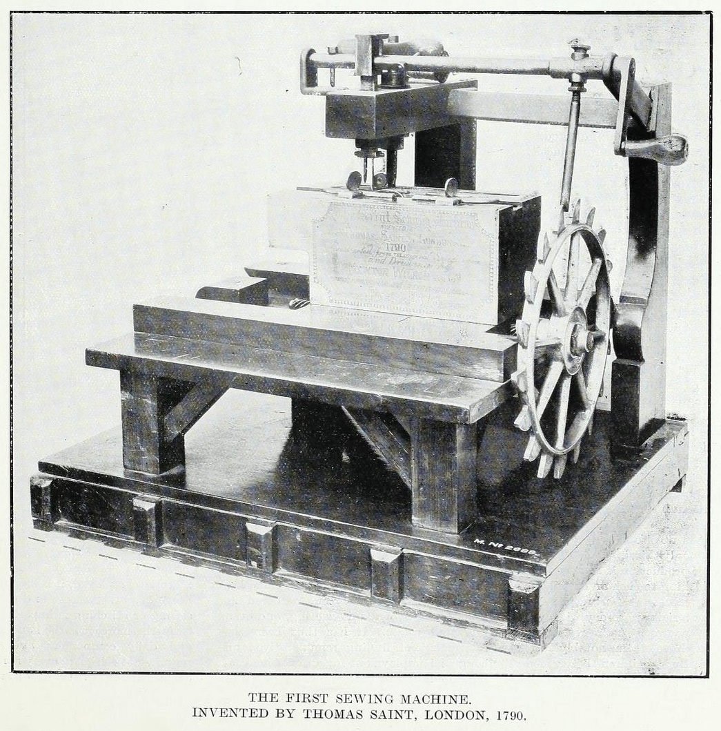 1790년, 영국의 발명가 토마스 세인트는 최초의 재봉틀 설계를 발명했다.[3] 그의 기계는 가죽과 캔버스 재료에 사용하기 위한 것이었다. 세인트가 작동하는 모델을 가지고 있었을 가능성이 있지만, 현존하는 증거는 없다. 그는 숙련된 가구 제작자였으며, 그의 장치에는 돌출된 팔, 공급 메커니즘(짧은 길이의 가죽에 적합), 수직 바늘대 및 루퍼와 같은 많은 실용적이고 기능적인 특징이 포함되어 있었다.