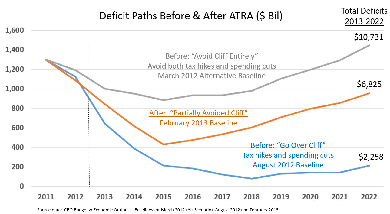 큰 정부를 지향하는 민주당은 증세에는 찬성했지만 세출 삭감에는 부정적이었고, 작은 정부를 지향하는 공화당은 증세에는 반대했지만 세출 삭감에는 적극적이었다. 양당은 합의를 이루지 못하다가, 2012년 12월 31일에 이르러서야 부유층을 제외한 계층을 대상으로 한 감세 영구화와 가구 연소득 45만 달러 이상 부유층 증세를 통해 가계 평균 세율을 1.8% 증가에 억제하고, 세출 강제 삭감을 2013년 2월 28일까지 2개월간 동결하는 법안을 가결했다. 이로 인해 대폭적인 실질 증세와 강제 세출 삭감으로 인한 재정 절벽은 피할 수 있었다.[176]