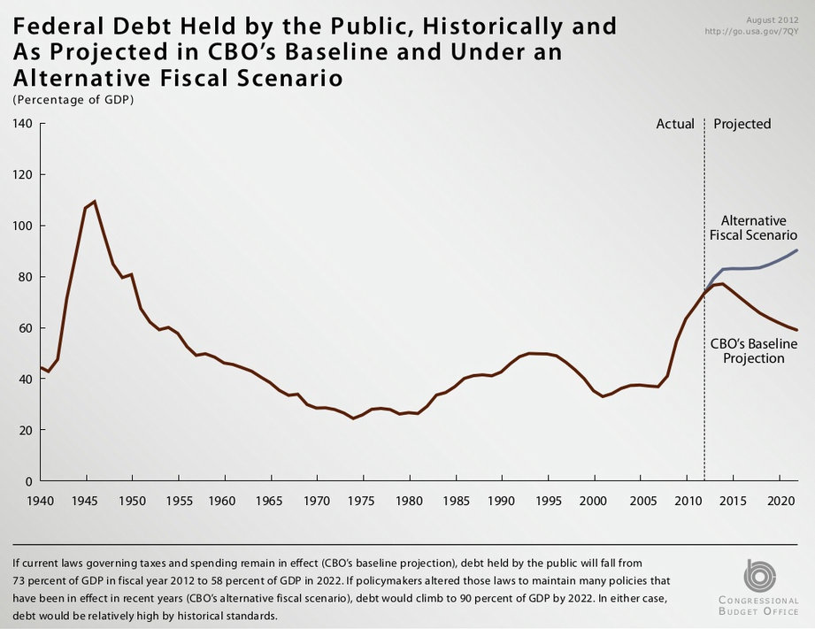 부시 감세 종료와 강제 세출 삭감이 실시되면 GDP 대비 3.3%에 해당하는 5조달러 규모의 재정 적자가 해소될 것으로 예상되었으나, 부시 감세 연장 기한 종료로 90%의 가계가 실질적인 증세를 겪고 가계 평균 세율이 약 4.5% 상승하며, 대폭적인 세출 삭감까지 더해져 미국 및 세계 경제에 악영향을 미칠 수 있다는 우려가 제기되었다. 이를 "'''재정 절벽'''"이라고 불렀다.[176] 2011년 8월 5일 스탠더드 앤드 푸어스는 미국 국채의 신용 등급을 강등했고, 8월 8일에는 미국 국채 쇼크가 발생했다.[176][177][178][179]