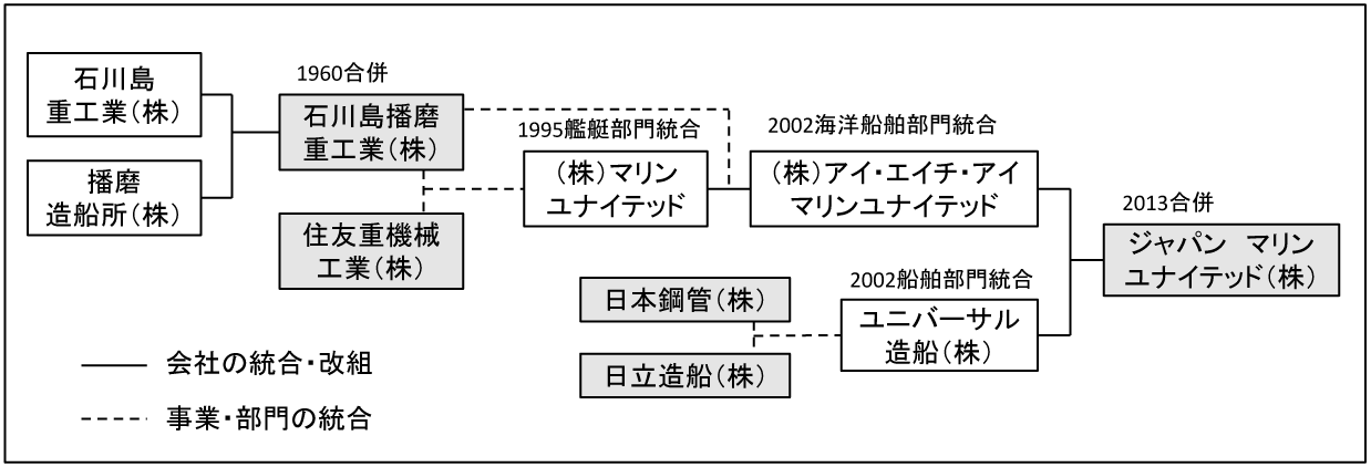 2013년 1월 1일 - 유니버설 조선과 IHI 마린 유나이티드가 합병하여 재팬 마린 유나이티드가 발족되었다. 출자 비율은 JFE 홀딩스 45.93%, IHI 45.93%, 히타치 조선 8.15%였다.[1][2]회사명 | 설립 연도 | 비고 |