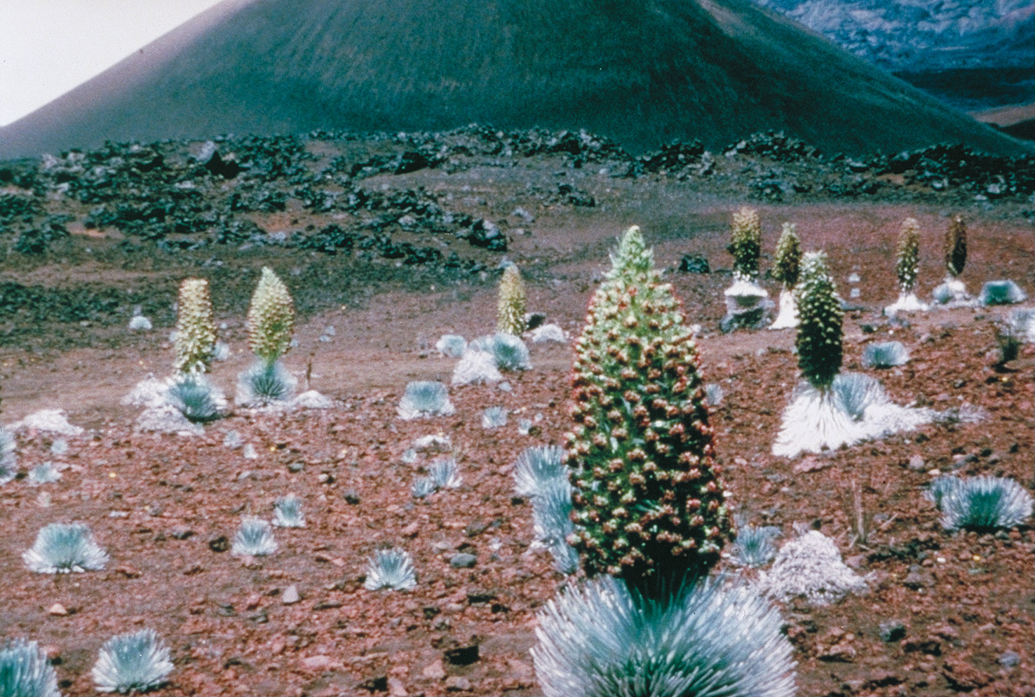 식물에서 가장 유명한 적응 방산의 예는 하와이 실버스워드이다. 이 식물은 최대 20년 동안 긴 은빛 잎을 유지하며 살다가 한 번 꽃줄기를 피운 후 죽는 고산 사막에 사는 ''Argyroxiphium'' 종에서 이름을 따왔다.[18] 하와이 실버스워드 연합은 실버스워드를 포함하여 나무, 관목, 덩굴, 쿠션 식물 등 28종의 하와이 식물로 구성되어 있다.[19] 실버스워드 연합은 600만 년 이전에 하와이에서 기원한 것으로 여겨지며, 이는 하와이에서 가장 젊은 적응 방산 사건 중 하나이다.[19] 이는 실버스워드가 하와이의 현대 고지대 섬에서 진화했으며, 서부 북아메리카에서 카우아이로 도착한 단일 공통 조상으로부터 유래했음을 의미한다.[19] 오늘날 실버스워드의 가장 가까운 현대 친척은 국화과에 속하는 캘리포니아 타르위드이다.[19]