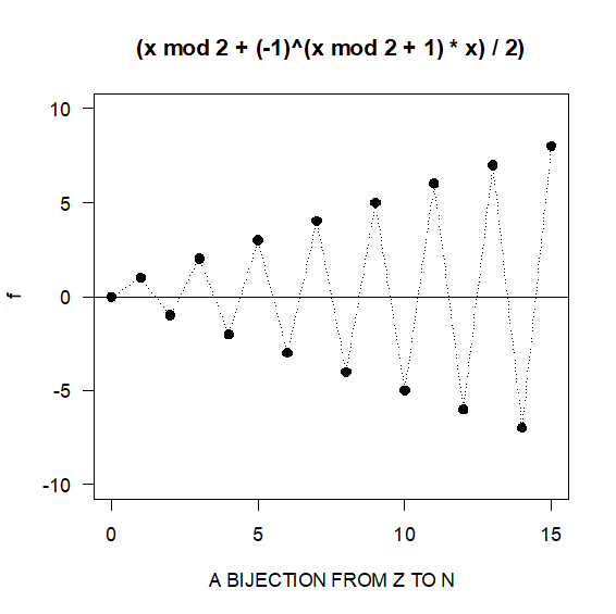 자연수에서 정수로의 전단사 함수. ''n'' ≥ 0에 대해 2''n''을 −''n''으로, 2''n'' − 1을 ''n''으로 매핑한다.