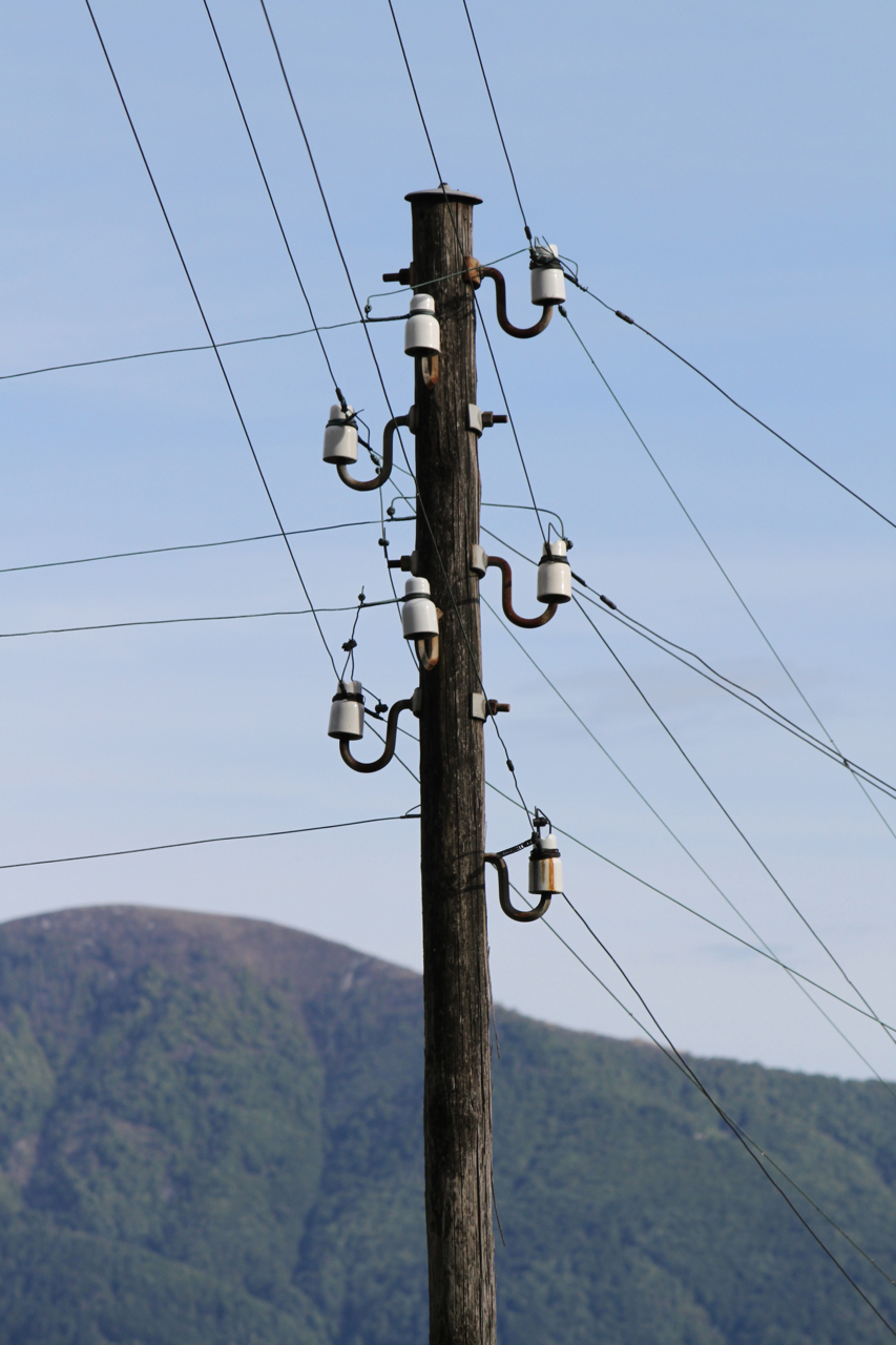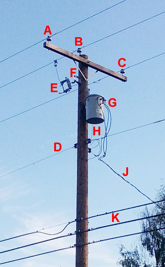 전력선과 통신선이 모두 설치된 전봇대에서는, 안전을 위해 전기 전력 배전선과 관련 장비가 통신 케이블 위에 설치된다. 전선은 애자에 의해 지지된다. 전력은 3상 시스템으로 전송되며, "A", "B", "C"로 표시된다.