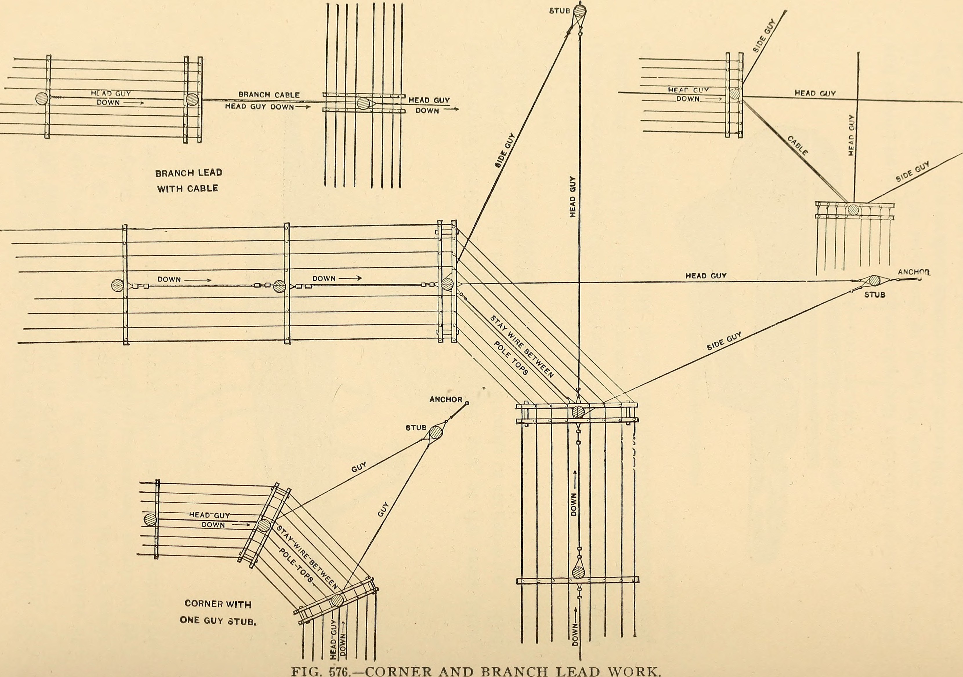 - 통신선로의 지지 (현대에는 예를 들어 전화선, 광케이블, 케이블 TV용 케이블 등의 지지.)