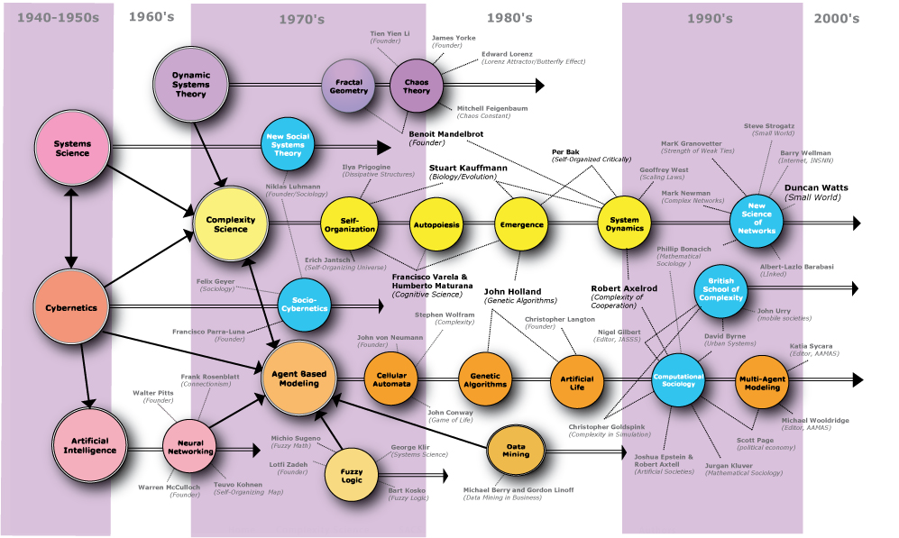 전후 시대에 배니바 부시의 차동 분석기, 존 폰 노이만의 세포 자동자, 노버트 위너의 사이버네틱스, 클로드 섀넌의 정보 이론은 기술 시스템의 복잡성을 모델링하고 이해하는 데 영향력 있는 패러다임이 되었다.[10] 이에 대응하여 물리학, 생물학, 전자공학, 경제학 등의 분야의 과학자들은 모든 자연 및 물리적 현상이 공통적인 패턴과 속성을 가진 시스템 내의 상호 관련된 요소들의 표현이라는 일반 시스템 이론을 명확히 설명하기 시작했다.[10]