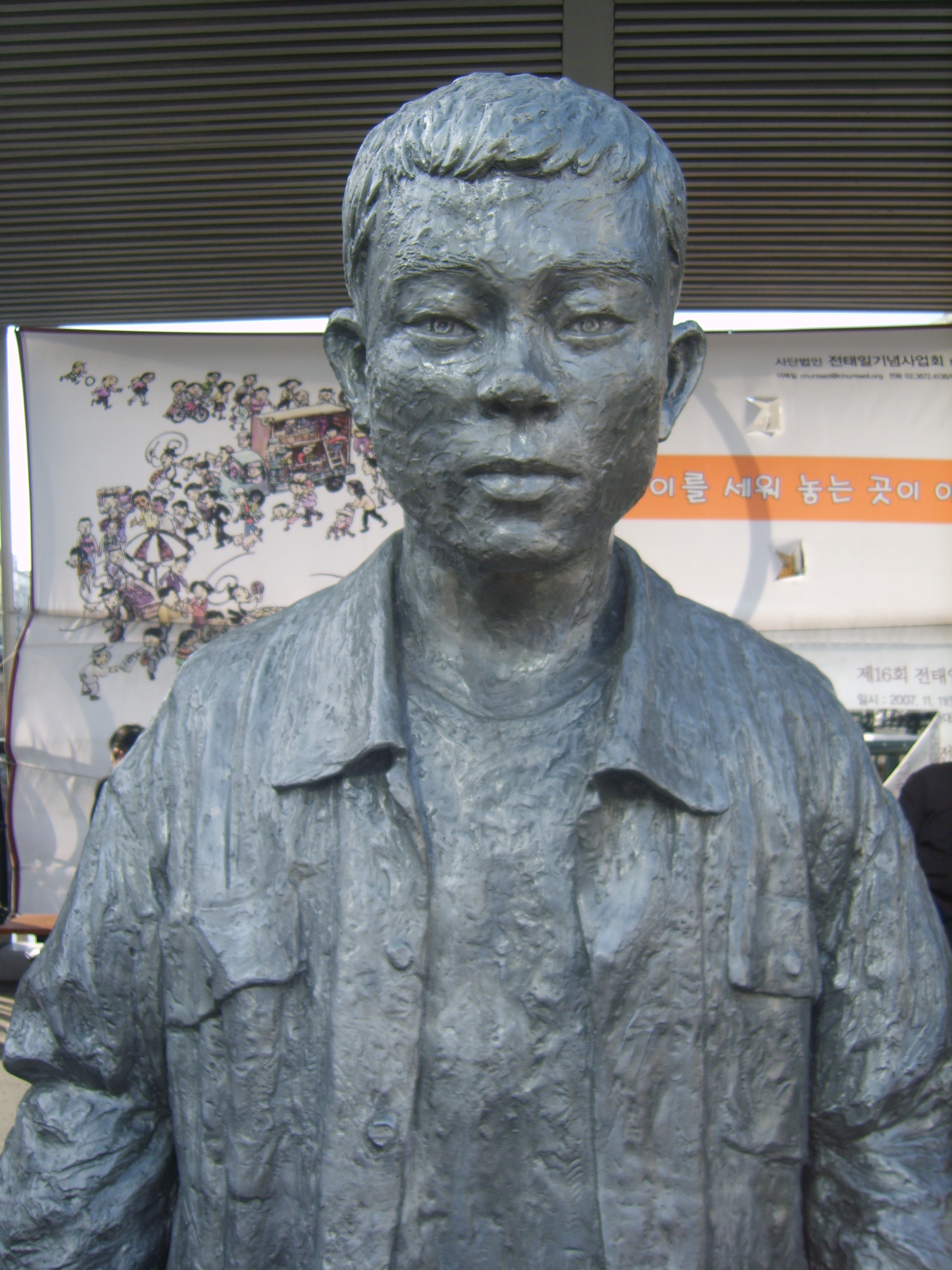 전태일은 1948년 대구에서 태어나 가난한 환경 속에서 성장했으며, 1960년대 서울 청계천 평화시장에서 의류 제조업체 시다로 일하며 열악한 노동 환경을 목격했다. 근로기준법의 부당함을 알게 된 그는 노동자들의 권익 보호를 위해 '바보회'를 조직하고 노동운동에 헌신했으나, 1970년 11월 13일 근로기준법 준수를 외치며 분신하여 사망했다. 그의 죽음은 노동 운동의 기폭제가 되었고, 대한민국 민주화 운동에 큰 영향을 미쳤으며, 현재까지도 노동 운동의 상징으로 기억되고 있다.