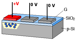MOS 커패시터에 빛이 닿으면 전자-정공 쌍이 공핍 영역에서 생성된다. 이들은 전기장에 의해 분리되어 전자는 표면으로, 정공은 기판으로 이동한다. 이러한 광 생성 과정은 양자 효율의 최대 95%까지 가능하다.[23]