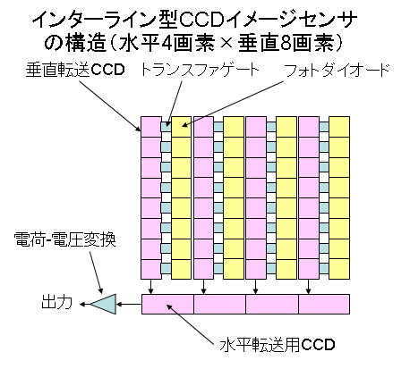 각 화소의 포토다이오드와 화소에 대응하는 수직 CCD의 각 소자 사이에는 아날로그 스위치 역할을 하는 트랜스퍼 게이트가 있으며, 읽기는 다음과 같은 순서로 수행된다.