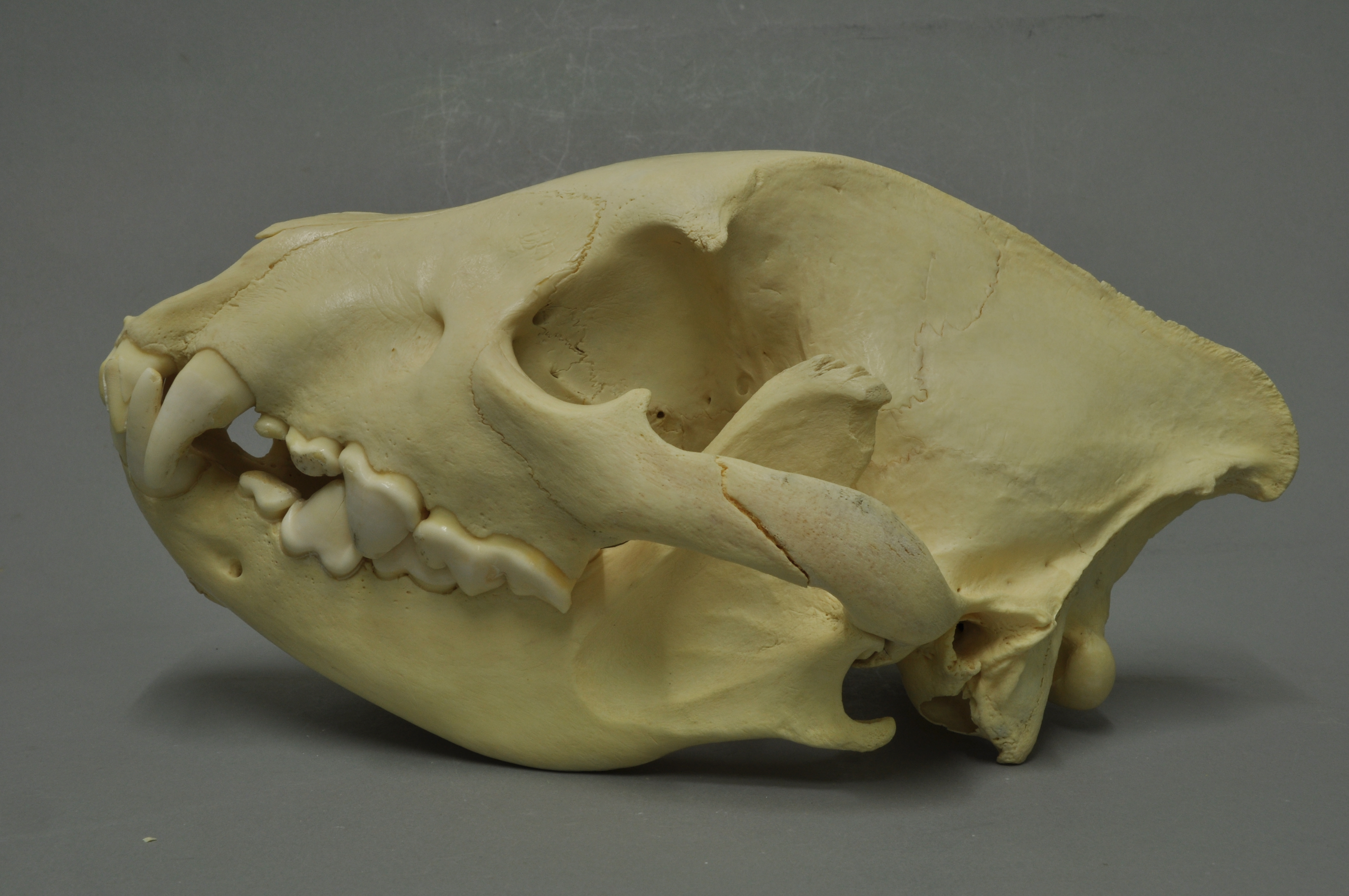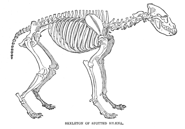 점박이하이에나의 두개골은 줄무늬하이에나의 두개골과 크기가 훨씬 크고 시상 능선이 좁다는 점에서 다르다. 크기에 비해, 점박이하이에나는 식육목 중에서 가장 강력하게 만들어진 두개골 중 하나를 가지고 있다.[35] 작은어금니는 튼튼하며, 강한 턱 힘과 함께 먹이의 뼈도 부술 수 있다.[184] 점박이하이에나는 불곰의 뼈를 부수는 능력을 능가하며,[38] 자유롭게 돌아다니는 하이에나는 지름 7 cm의 기린의 긴 뼈를 부수는 것이 관찰되었다.[39]