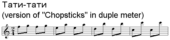 러시아에서는 2박자로 된 "타티-타티" 또는 "커틀릿 폴카"로 알려진 곡이 있는데, 이는 기본적인 두 손가락 피아노 연습과 동일하며 젓가락 행진곡과 유사한 형태를 띤다. 젓가락 행진곡이 양손을 동시에 사용하여 화음을 연주하는 반면, "타티-타티"는 양손의 음을 번갈아 연주한다.[10]