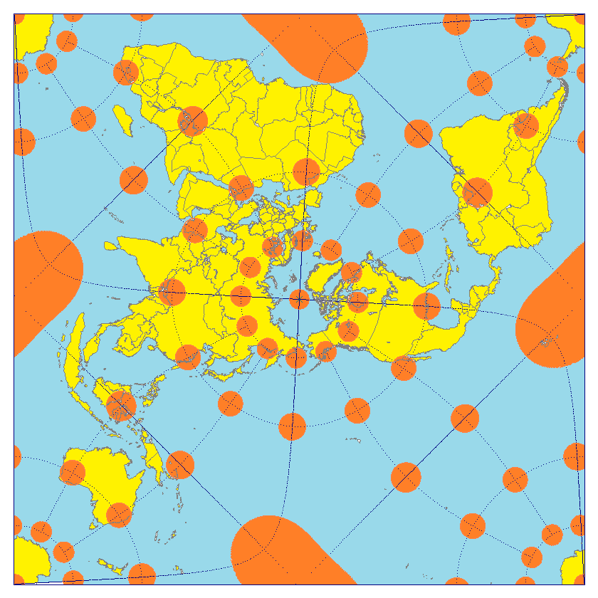 - 오귀스트 외접사이클로이드 도법 (원 안의 구의 라그랑주 도법과 3차 복소수 다항식의 합성)