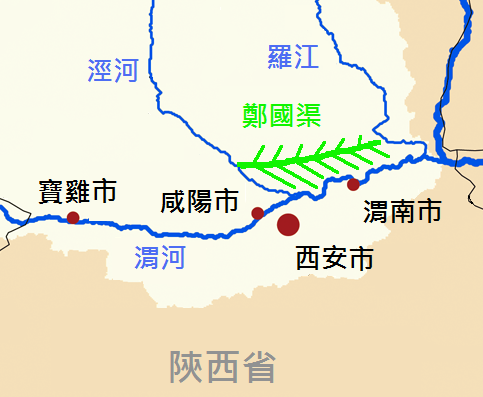 정국(鄭国)은 전국 시대 말기, 진나라의 세력이 강대해진 시대의 인물이다. 진 시황 원년(기원전 246년)에 시안 북쪽의 호구(현재의 징양현 부근)에서 label=경수/泾河중국어(위수의 지류)의 물을 갈라 label=낙수/洛河 (渭河)중국어 (역시 위수의 지류)에 이르게 하는 구거 사업이 시작되었다.[5]