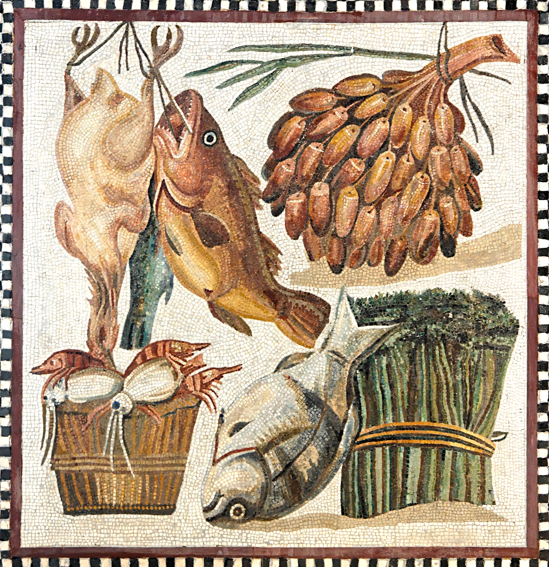 비슷한 정물화는 의도가 더 단순하게 장식적이지만 사실적인 원근법을 가지고 있으며, 과일이 담긴 유리 그릇의 친숙한 모티프를 포함하여 폼페이, 헤르쿨라네움 및 빌라 보스코레알레에서 발굴된 고대 로마 벽화와 바닥 모자이크에서도 발견되었다. 부유한 로마인들의 집에서 발견된 "엠블레마"라는 장식 모자이크는 상류층이 즐겨 먹는 음식의 종류를 보여주고, 환대의 표식, 계절과 삶을 기념하는 역할도 했다.[5]