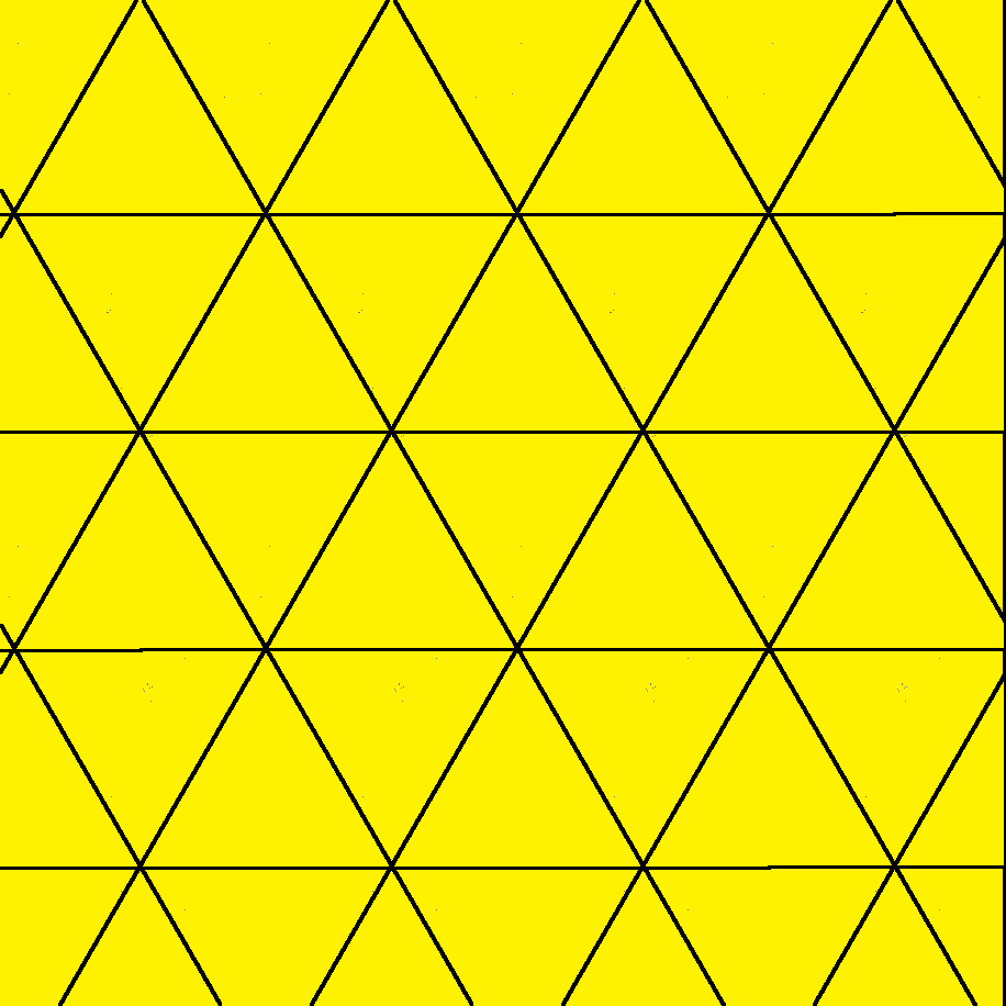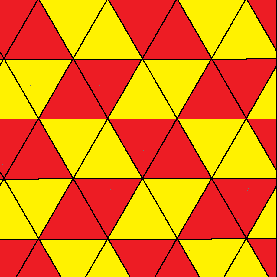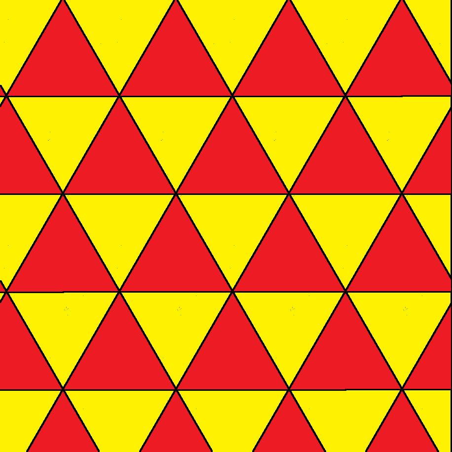 정삼각형 채우기는 모든 꼭짓점 주변에 정삼각형이 6개 있는 정다각형 타일링으로, {3,6} 토폴로지를 가진다. 동일한 면(면-전이성)과 점-전이성을 가지는 5가지 변형이 존재한다. 아래의 대칭은 모든 면의 색이 같다고 가정한다.[9][4]