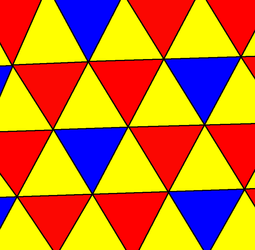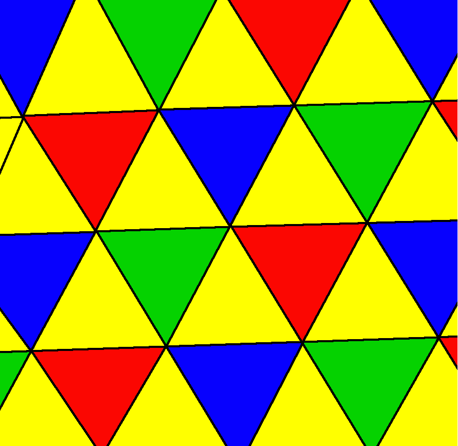 삼각형 타일링에는 9가지 균일 색칠이 있다. 꼭짓점 주위의 6개 정삼각형에 색을 붙여 111111, 111112, 111212, 111213, 111222, 112122, 121212, 121213, 121314와 같이 나타낸다. 이 중 111212와 111112는 121213에서 1과 3을 합쳐 만들 수 있고, 111213은 121314를 줄여 만들 수 있다.[6][1]