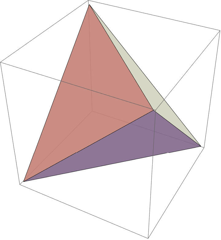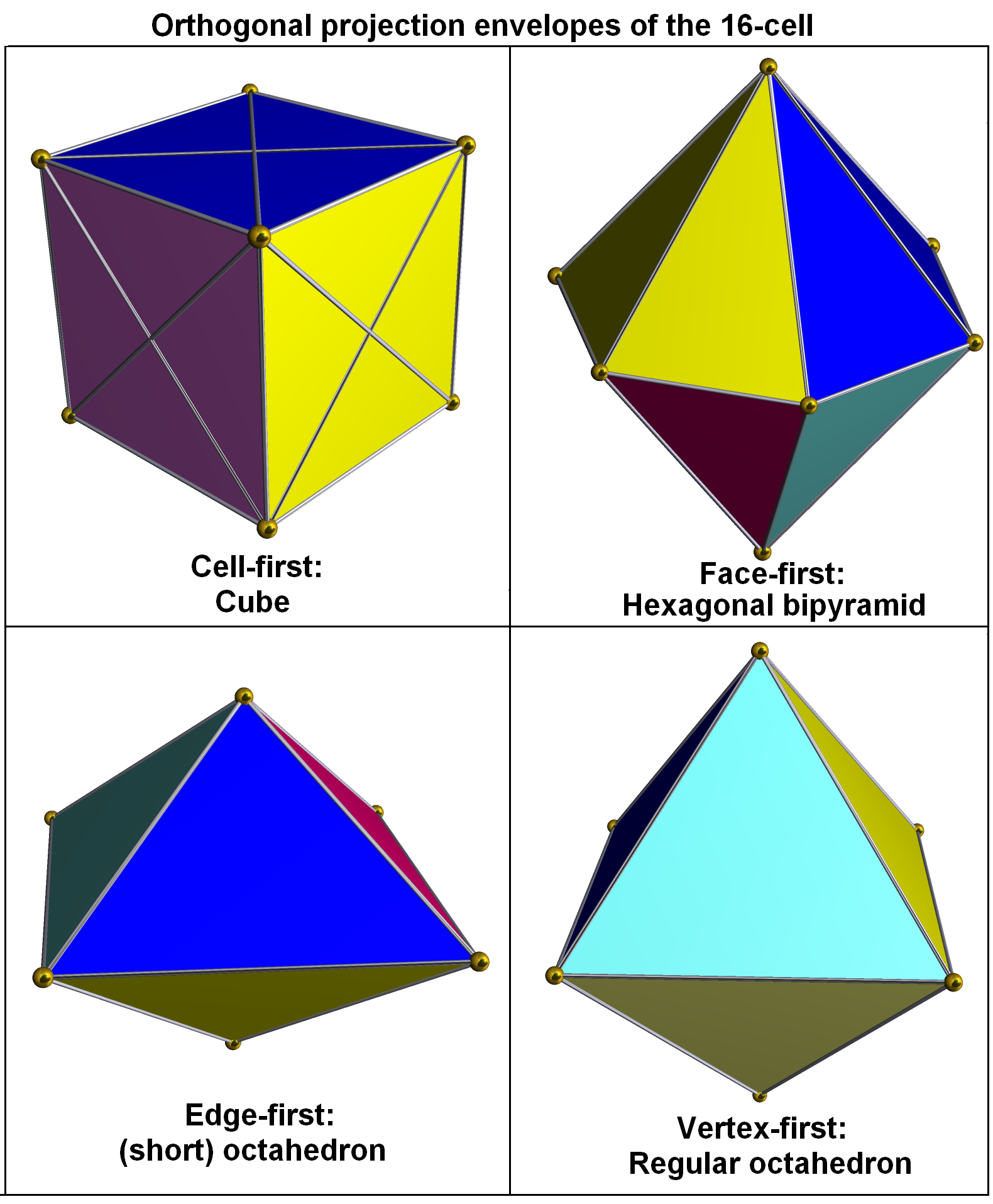 16-포체의 꼭짓점 우선 평행 투영을 3차원으로 투영하면 팔면체 엔벨로프가 나타난다. 이 팔면체는 좌표 평면을 따라 잘라서 8개의 사면체 부피로 나눌 수 있다. 이러한 각 부피는 16-포체의 세포 쌍의 이미지이다. 관찰자에게 가장 가까운 16-포체의 꼭짓점은 팔면체의 중심에 투영된다.7. 3. 모서리 및 면 우선 투영