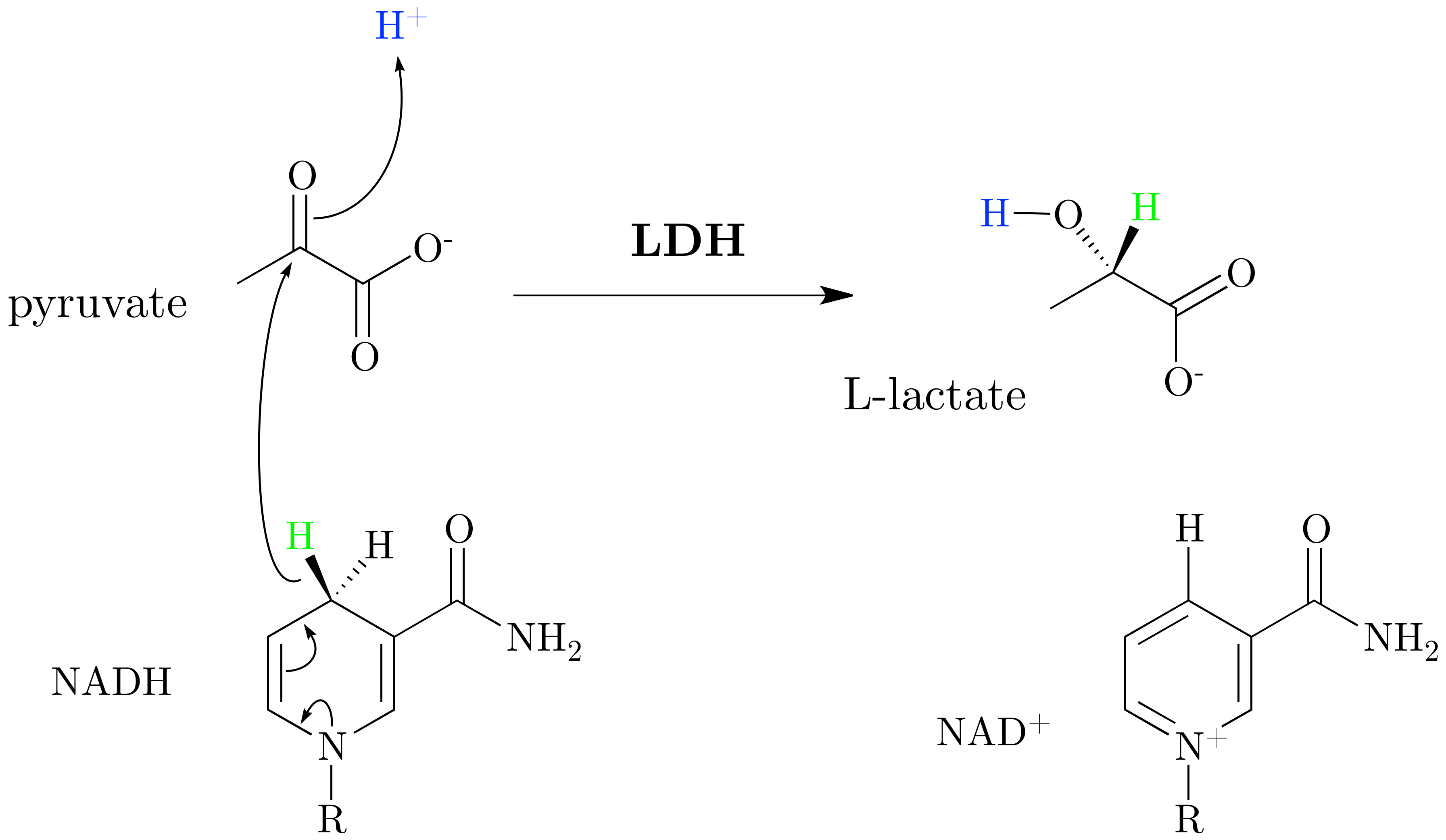 젖산 탈수소효소는 기질의 상대적인 농도에 의해 조절된다. 젖산 탈수소효소는 극도의 근육 활동 기간 동안 젖산 탈수소효소 반응에 대한 기질의 증가로 인해 더 활성화된다. 골격근이 높은 수준의 힘을 생산하는 동안 산소 호흡에 의한 ATP의 공급과 관련하여 ATP에 대한 수요는 유리 ADP, AMP 및 Pi의 축적으로 이어진다. 이어지는 해당과정, 특히 피루브산의 생산은 피루브산 탈수소효소 및 다른 셔틀 효소가 피루브산을 대사하는 능력을 초과한다. 젖산 탈수소효소를 통한 흐름은 피루브산과 NADH의 증가된 수준에 반응하여 피루브산을 젖산으로 대사하는 것을 증가시킨다.[55]젖산 탈수소효소는 젖산과 피루브산의 상호 변환을 촉매한다. 이때 NADH와 NAD+의 상호 변환도 동시에 일어난다. 피루브산이 젖산으로 변환되는 반응은 산소 부족과 관계없이 일어나며, 포도당이 증가하면 젖산이 생성되는 방향으로 반응이 진행된다. 해당 과정의 균형을 유지하는 중요한 반응이다. 이와 반대되는 반응이 간의 코리 회로에서 일어난다.