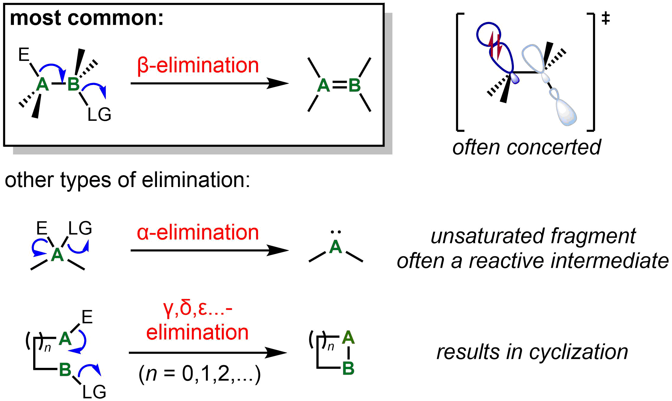 β-제거 반응은 인접한 탄소 원자에서 친전자체와 친핵체를 잃는 반응으로, 제거 반응 중 가장 흔한 유형이다. C=C 또는 C=X 결합을 포함하는 안정적인 생성물을 형성하는 능력뿐만 아니라 궤도 정렬 고려 사항은 다른 제거 과정보다 β-제거를 강력하게 선호한다.[7] 그러나 β-제거가 발생할 수 없는 시스템의 경우 다른 유형의 제거 반응도 알려져 있다.