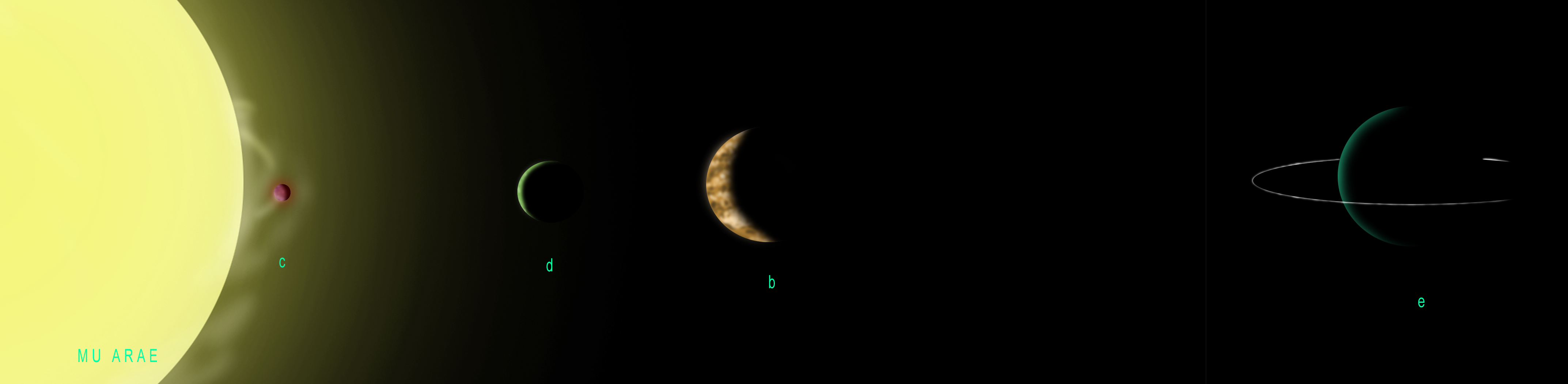 제단자리 뮤 e는 지구가 받는 자외선과 비슷한 양을 받는 궤도(자외선 생물권)에 있지만, 액체 물이 존재하기에는 너무 뜨겁다.