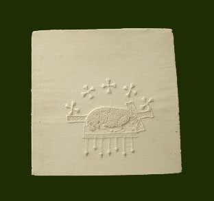 흰색 린넨으로 덮인 덮개, ''Agnus Dei'' 자수가 새겨져 있음
