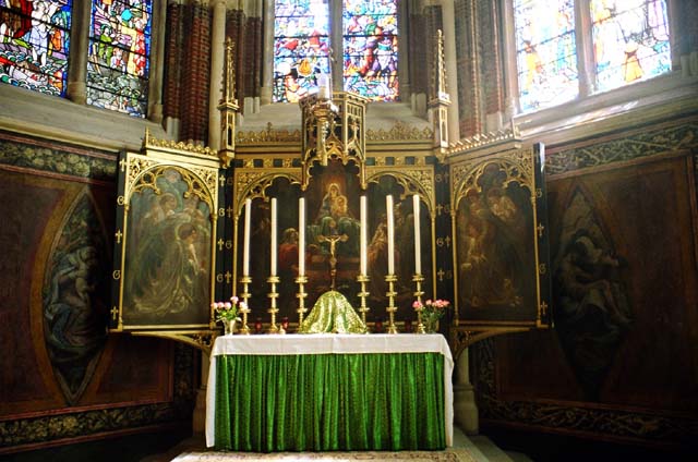 • '''제대포''' 또는 안테펜디움(Antependium)은 제단 앞면과 크기가 같다. 종종 태피스트리, 실크 또는 다마스크로 만들어져 화려하게 장식된다. 일부 제대포는 최고의 재료와 자수를 사용하여 제작된 뛰어난 예술 작품이기도 하다. 반면, 평범한 제대포를 사용하는 교회도 있다. 모든 제대포의 공통적인 특징은 교회력에 따라 색상이 변경된다는 점이다. 사용되는 색상으로는 녹색, 빨간색, 보라색, 파란색, 검은색, 흰색, 금색 또는 표백하지 않은 무명천 등이 있다.
