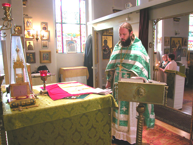 러시아 정교회 사제가 성찬례를 집전하고 있다. 성찬상(제대)에는 녹색 ''''이 있고, ''안티멘시온''(금색)은 ''''(적색)과 함께 펼쳐져 있다.