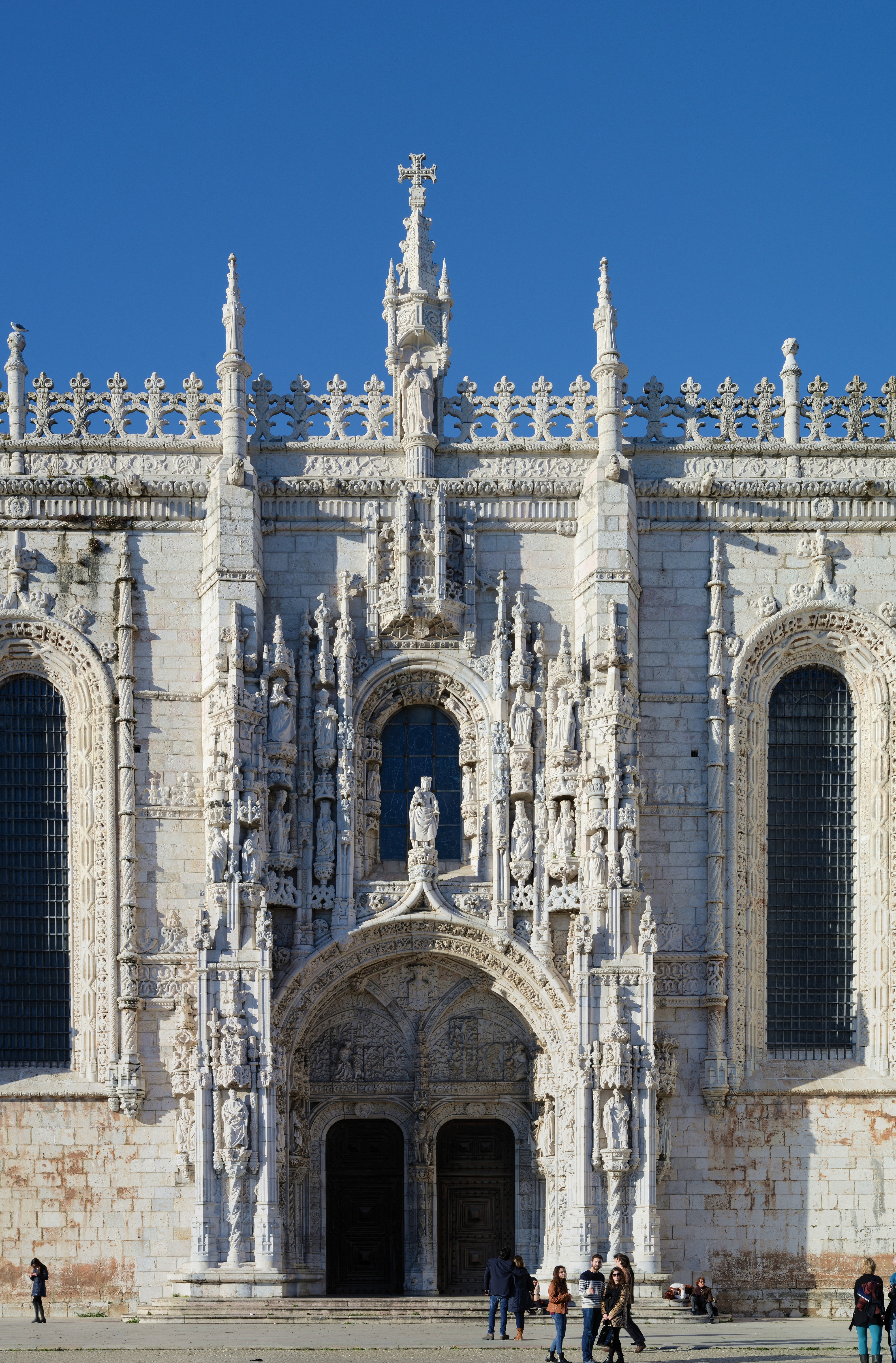 수도원의 화려한 측면 입구는 주앙 데 카스틸루가 설계했으며, 그의 시대에 가장 중요한 작품 중 하나로 여겨지지만, 사실 건물의 주 출입구는 아니다.[9] 이 문은 높이 32m, 폭 12m로 2층 높이에 달한다. 화려한 특징으로는 풍부한 박공과 첨탑이 있으며, 조각된 틈새에 캐노피 아래에 서 있는 많은 조각상들이 있고, 두 문 사이에는 항해왕 엔히크의 조각상이 받침대 위에 서 있다.