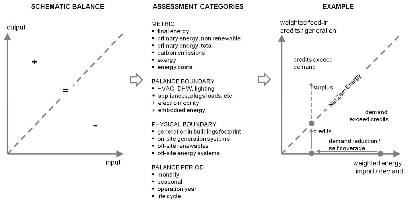 순 제로 에너지 건물: "넷 제로 에너지 태양광 건물으로"(Towards Net Zero Energy Solar Buildings) 공동 연구 프로그램 내의 과학적 분석을 기반으로, 국가의 정치적 목표, 특정 (기후) 조건 및 실내 조건에 대한 요구 사항에 따라 다양한 정의를 허용하는 방법론적 프레임워크가 설정되었다.[23] 순 ZEB에 대한 전반적인 개념적 이해는 재생 가능 에너지원에서 에너지를 생성하여 자체 에너지 수요를 보상할 수 있는 에너지 효율적인 그리드 연결 건물이다(그림 1그림 1: 순 ZEB 균형 개념: 가중 에너지 수입 대 에너지 수요(x축)와 에너지 수출(피드인 크레딧) 대 (부지 내) 발전(y축)의 균형). "순"이라는 표현은 건물과 에너지 기반 시설 간의 에너지 교환을 강조한다. 건물-그리드 상호 작용을 통해 순 ZEB는 재생 가능 에너지 기반 시설의 활동적인 부분이 된다. 이러한 에너지 그리드 연결은 에너지 자율 건물과 같이 계절별 에너지 저장 및 재생 에너지원으로부터의 에너지 생성을 위한 과도한 부지 내 시스템을 방지한다. 두 개념의 유사점은 다음과 같은 두 가지 조치의 경로이다. 1) 에너지 효율 조치 및 수동적 에너지 사용을 통해 에너지 수요를 줄인다. 2) 재생 가능 에너지원에서 에너지를 생성한다. 그러나 순 ZEB의 그리드 상호 작용과 그 수를 광범위하게 늘리려는 계획[24]은 에너지 부하의 전환에서 증가된 유연성과 피크 수요 감소에 대한 고려를 불러일으킨다.[25]