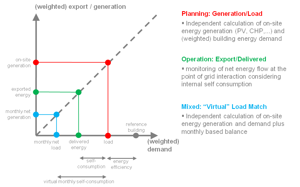 에너지 균형은 두 가지 균형 유형으로 수행될 수 있다. 1) 전달/수입 및 수출 에너지의 균형(부지 내에서 생성된 에너지의 자체 소비를 포함할 수 있는 모니터링 단계); 2) (가중된) 에너지 수요와 (가중된) 에너지 발전 간의 균형(설계 단계의 경우 일반 최종 사용자의 시간적 소비 패턴 -예: 조명, 가전 제품 등-이 부족하다). 또는 매월 잔류물만 연간 균형에 합산되는 월별 순 값을 기반으로 한 균형도 상상할 수 있다. 이는 부하/발전 균형 또는 "가상 월별 자체 소비"가 가정되는 수입/수출 균형의 특수한 경우로 볼 수 있다(그림 2 참조 및 비교).[30]
