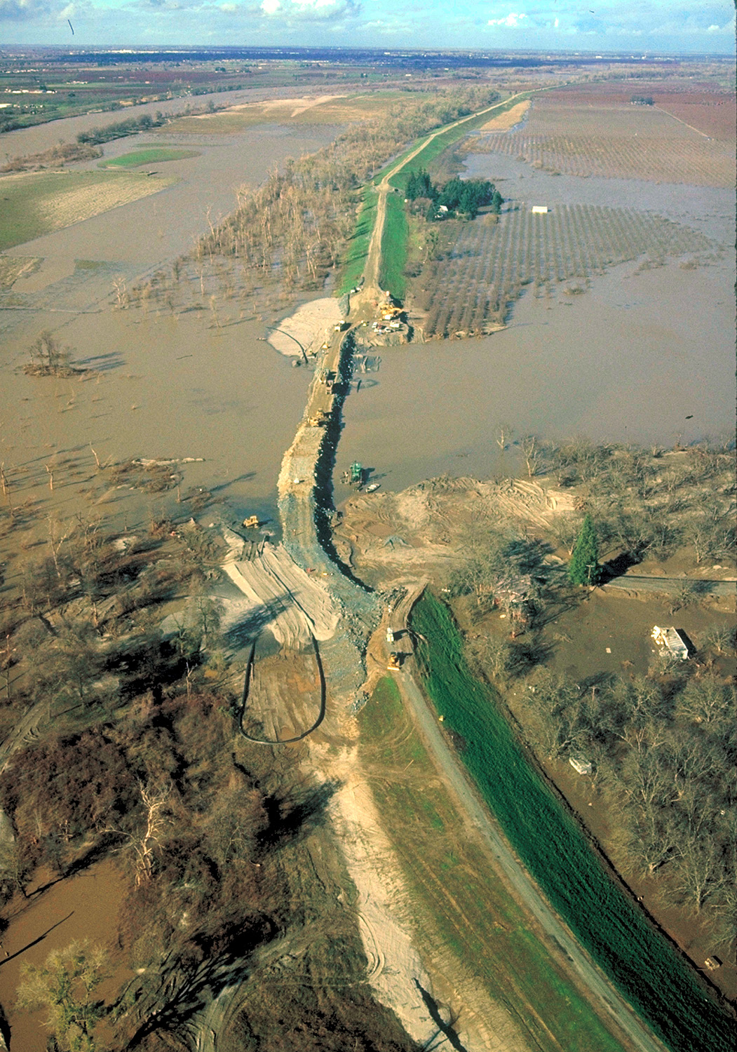 물이 제방의 정상을 넘어설 때 제방이 붕괴되었다고 말하기도 하는데, 이는 범람원에 홍수를 일으키지만 제방을 손상시키지 않기 때문에 미래 홍수에 대한 영향은 적다.